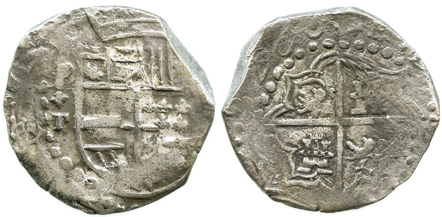 Potosi, Bolivia, cob 8 reales, (1)620T, date appearing as "6Z00", quadrants of cross transposed, Grade-1 quality but Grade 2 on the certificate. S-P21; KM-10; CT-137. 26.8 grams. Call this the "ZOO" coin, because the bold date shows the usual sideways-N punch for the 2 followed by two zeroes with no apparent double-striking, bold P+T, mostly toned, the cross and shield full and uncorroded. With Fisher certificate #260631. Recovered from: Atocha, sunk in 1622 west of Key West, Florida