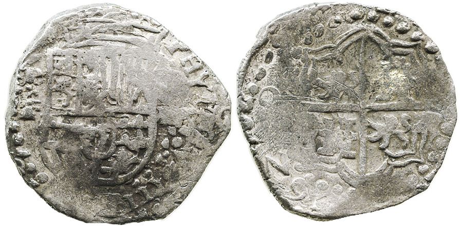 Potosi, Bolivia, cob 8 reales, (1)620T, date at 7 o'clock, quadrants of cross transposed, Grade 1. S-P21; KM-10; CT-137. 26.8 grams. Full but crude cross and shield, the latter much smaller than usual (4R size?), with king's name and ordinal PHYLYPVS III, full 6Z0 (with unusual space between last two digits) in rotated position, no corrosion, pedigreed to the cartographer who pinpointed the "mother lode" in 1985. With Fisher certificate #160986, and pedigreed to the Edward J. Little collection. Recovered from: Atocha, sunk in 1622 west of Key West, Florida
