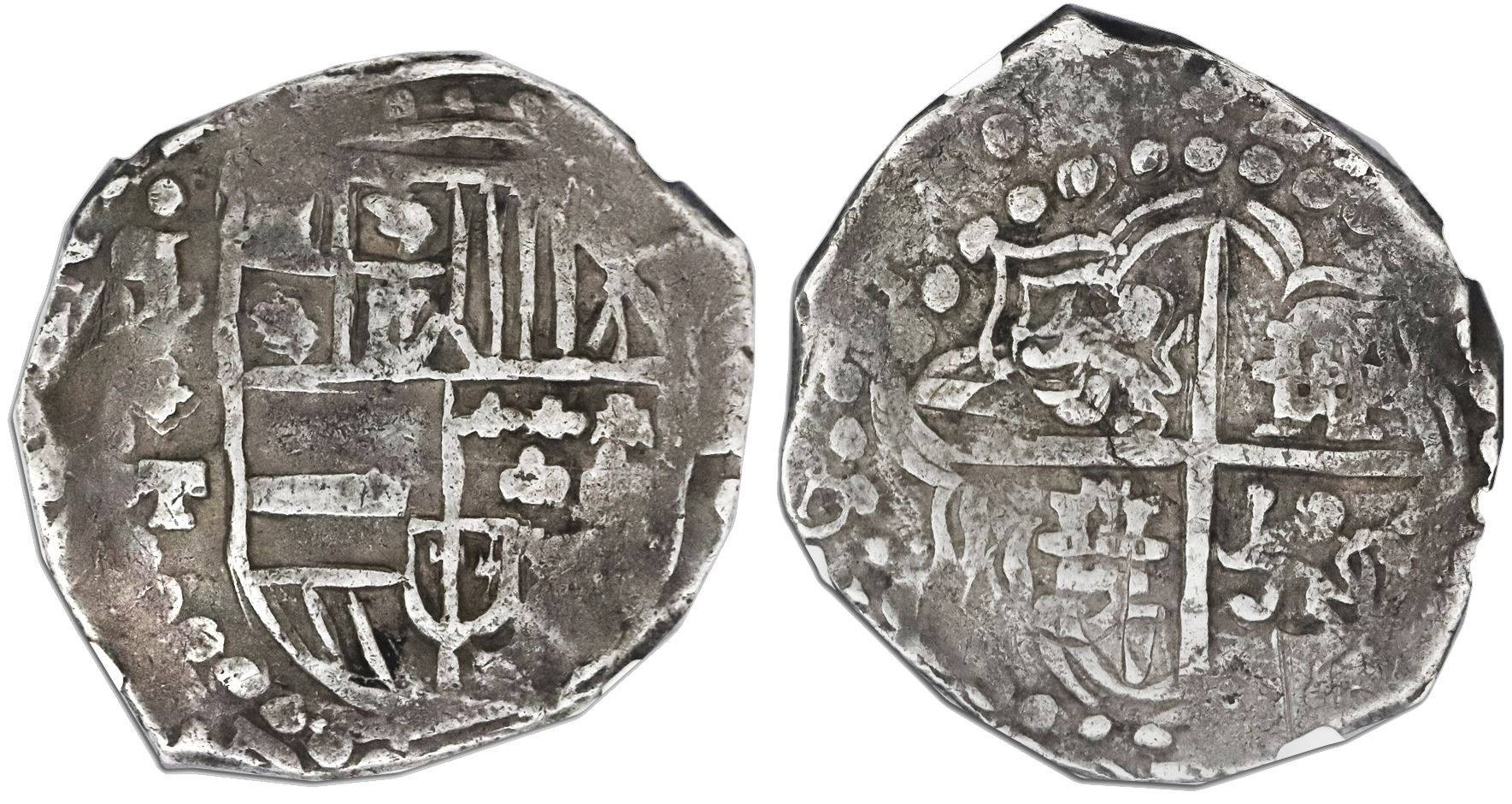 Potosi, Bolivia, cob 8 reales, (1)621T, mintmark retrograde P over normal P ("phi"), quadrants of cross transposed, rare, NGC VF 35. S-P21; KM-10; Cal-933. 27.22 grams. Mostly clear date at 8-10 o'clock with big space after that showing only an ornamental dot, bold assayer, weak but certain "phi" mintmark, good full shield and cross with nice toning, VF+. NGC #4485342-003 (date not specified on label).