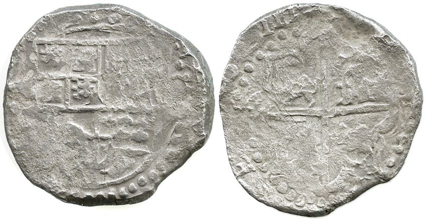 Potosi, Bolivia, cob 8 reales, (1)6ZIII [1623], assayer not visible, quadrants of cross transposed, very rare. KM-19. 24.9 grams. Full shield and cross despite moderate surface corrosion (AVF otherwise), but with bold III of date and most of the 6 and Z as well, popular as evidence of a interesting stop-gap solution to an apparent lack of a 3-punch (or knowledge of what a 3 looked like, perhaps).