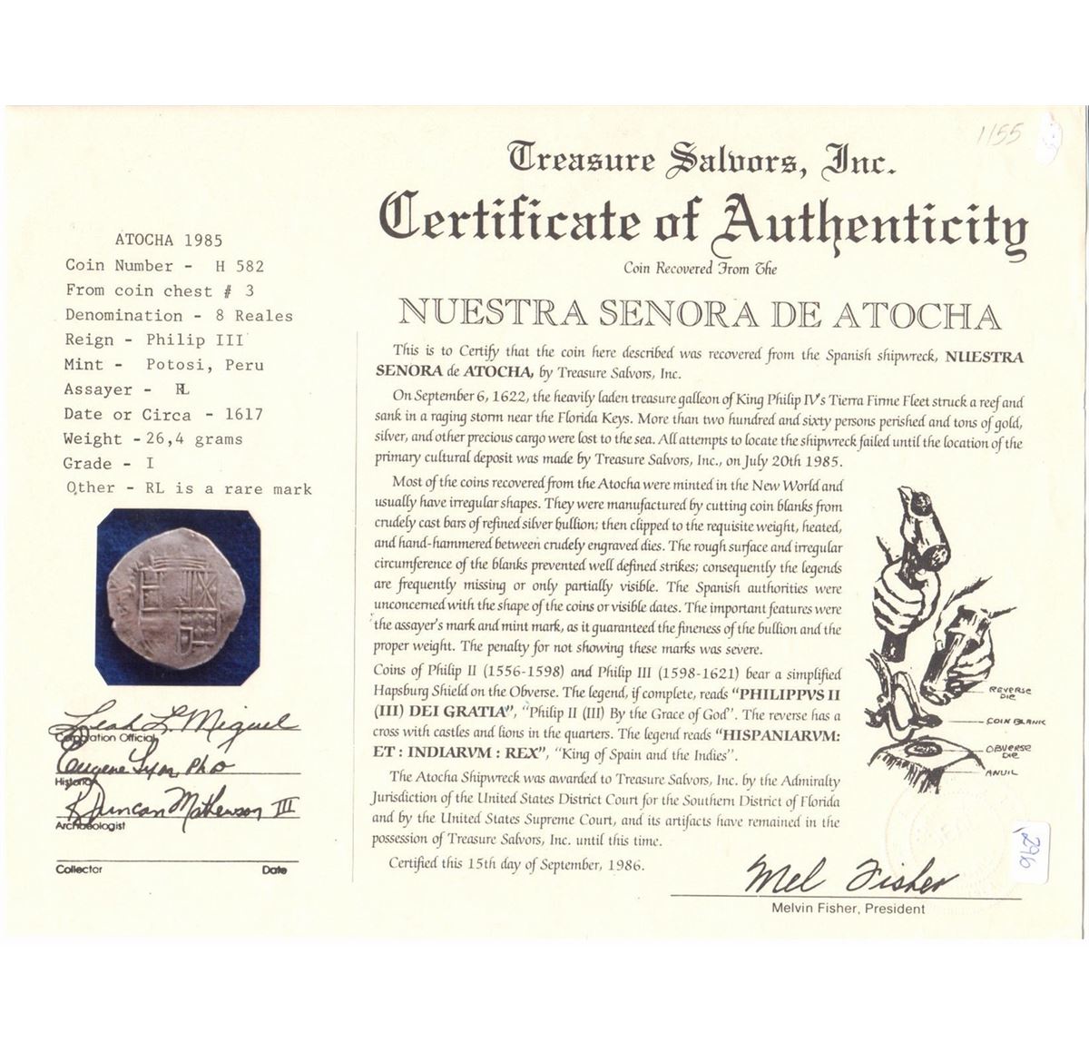 Potosi, Bolivia, cob 8 reales, (16)18PAL, Grade 1, rare. S-P20; KM-10; CT-130. 26.43 grams. Bold full shield and cross, full mintmark-assayer, bottom half of 18 of date, practically no corrosion. From the Hebert collection, with Fisher/Miguel photo-certificate #H-582 and pedigreed to the Ponterio auction of June 1998, with original lot-tag #593. Recovered from: Atocha, sunk in 1622 west of Key West, Florida