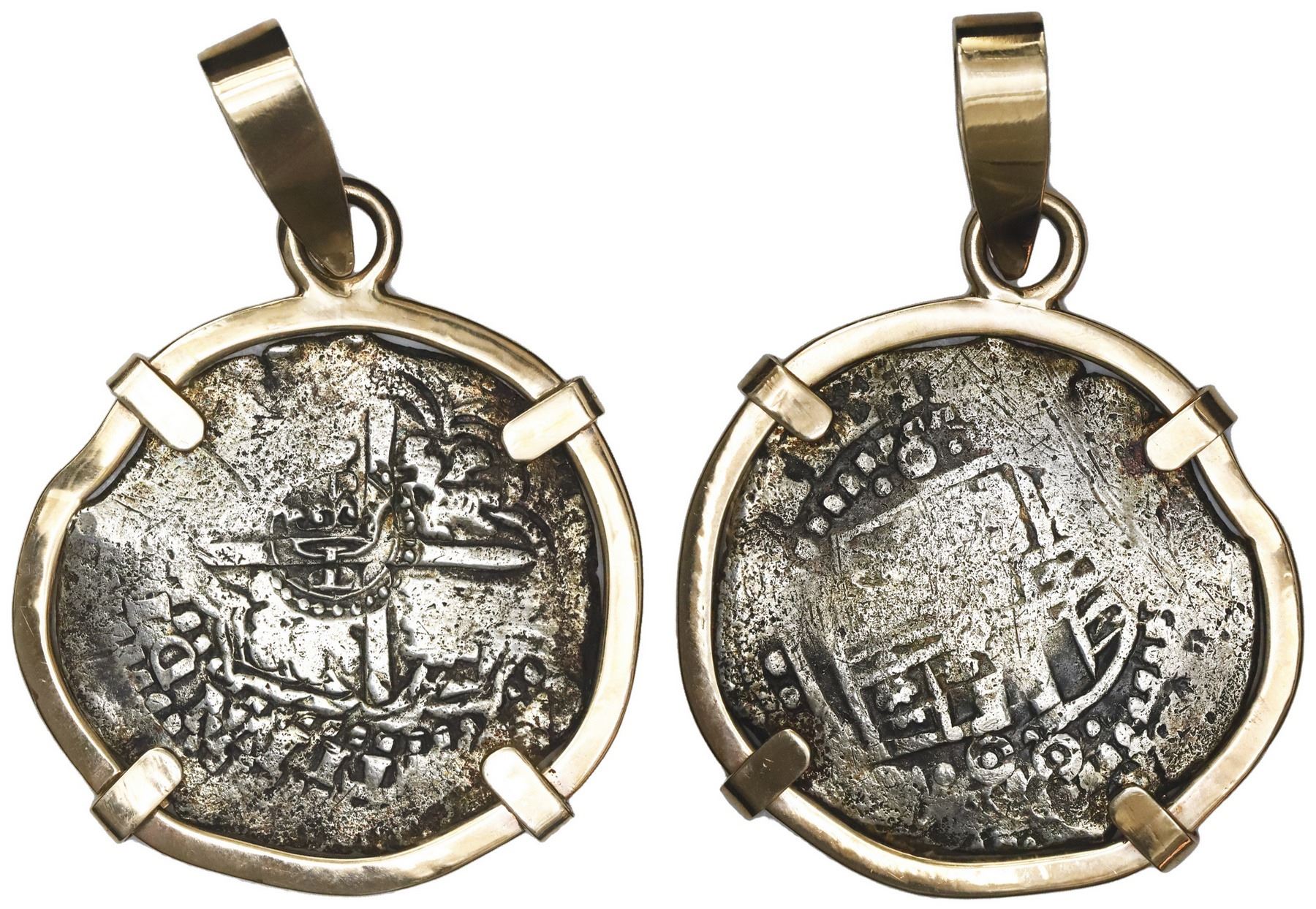 Potosi, Bolivia, cob 8 reales, (16)49O, ex-Capitana (1654), mounted cross-side out in 14K rose-gold bezel with large bail. 38.57 grams total. Broad-flan coin with choice full countermark in the very middle of a full but somewhat flat cross, full shield on other side, light surface corrosion with contrasting toning, heavy but simple bezel with massive bail to accommodate a large chain. From the Capitana (1654).