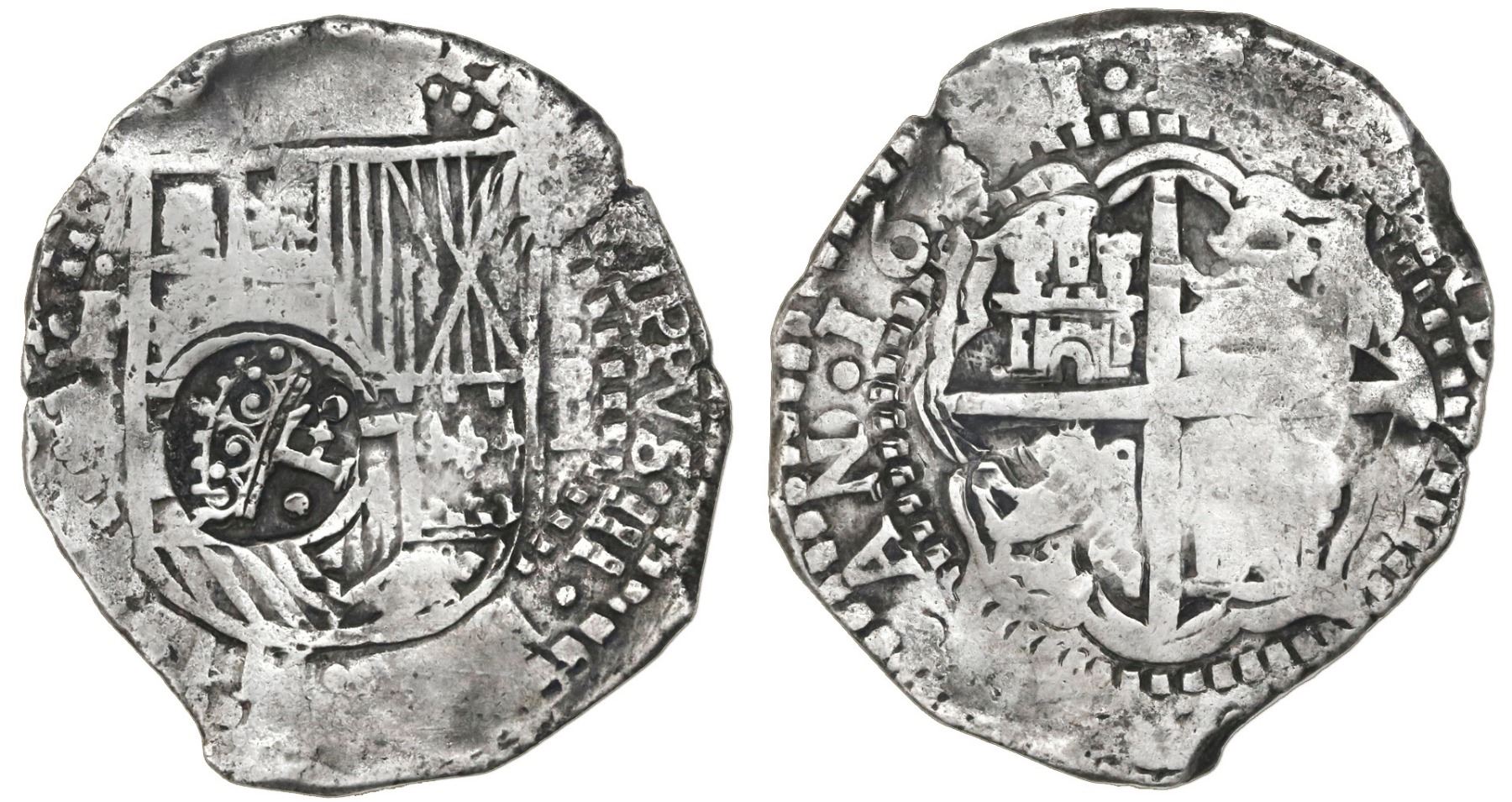Potosi, Bolivia, cob 8 reales, 16(5)1E, with crowned-dot-F-dot countermark on shield. S-P36; KM-19b; CT-511. 27.45 grams. Extremely bold and complete countermark (rare thus) on well-detailed full shield, most of king's name and ordinal in legend, full but partially weak cross, full 16 of date, nicely toned, minimal surface corrosion. Recovered from: Capitana, sunk in 1654 off Chanduy, Ecuador