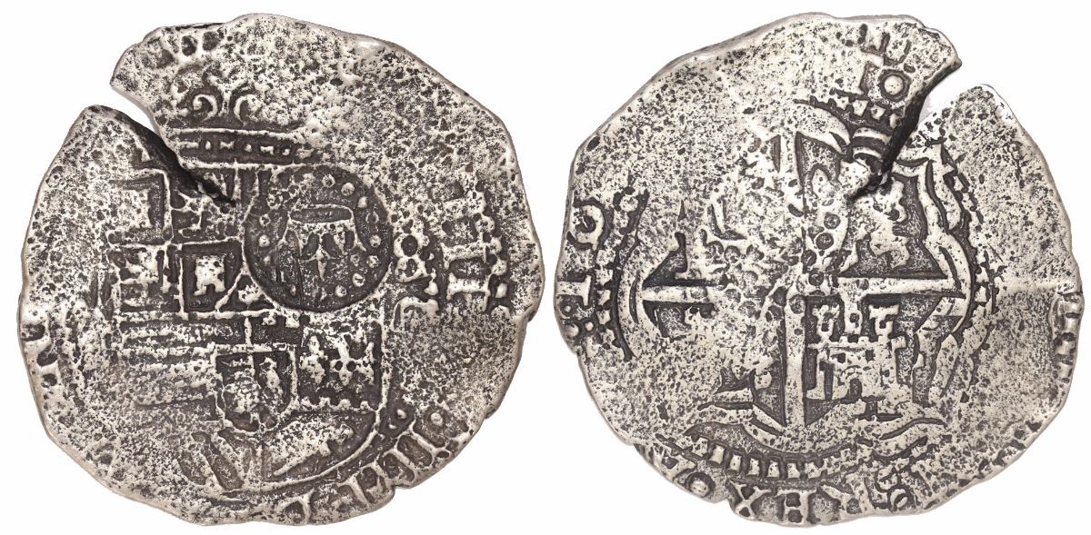 Potosi, Bolivia, cob 8 reales, 16(50-51)O, with crown-alone countermark on shield. 22.92 grams. Thin from corrosion (and with large edge-split) but with full shield and cross, 100% full countermark, nicely toned, bold king's ordinal IIII in legend. Recovered from: Capitana, sunk in 1654 off Chanduy, Ecuador