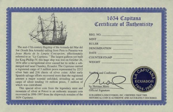 Potosi, Bolivia, cob 8 reales, (16)50O, no countermark (rare). S-P35; KM-19b; CT-509. 27.25 grams. Broad flan with good full shield and cross (both well centered), bold assayer O to left, double-struck date, no corrosion, edge-split, nice toning. With certificate from the salvagers. Recovered from: Capitana, sunk in 1654 off Chanduy, Ecuador
