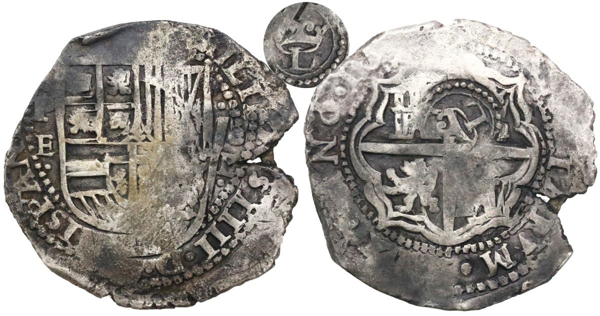 Potosi, Bolivia, cob 8 reales, 16(51-2)E, with crowned-L countermark on cross, from the Maravillas (1656). S-P36; KM-19b. 25.18 grams. Broad flan with some bold legend (king's ordinal IIII), full but partially flat shield and cross, clear countermark and assayer, toned VF with surface corrosion, large edge-split. From the Maravillas (1656).