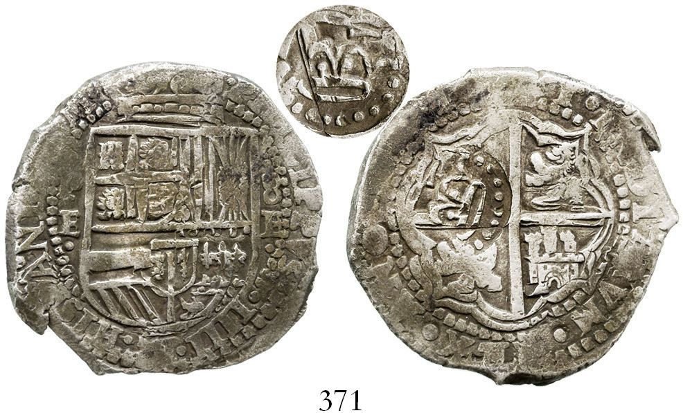 Potosi, Bolivia, cob 8 reales, (16)51E, with rare crown-alone countermark on cross, choice. S-P36; KM-19b; CT-511. 27.2 grams. Superb specimen, totally uncorroded, with well-detailed full shield and cross, 2 assayers, king's ordinal IIII, and (best of all) nearly full countermark with crown that looks like a jester's cap (Janson-Type E, 5-10 known), richly toned all over, even with parts of edge as sharp as the day this coin was made. From the Maravillas, sunk in 1656 off Grand Bahama Island