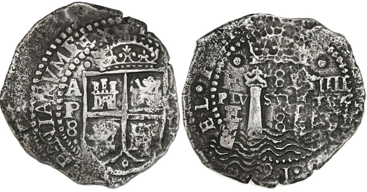 Potosi, Bolivia, cob 8 reales, 16(52)E transitional Type IV, from the Capitana (1654).