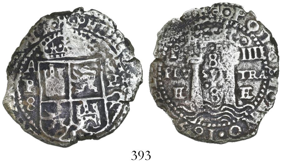 Potosi, Bolivia, cob 8 reales, (16)52E Transitional Type IV/A. S-P37; KM-A20.4; CT-432. 21.61 grams. Choice full inner details on both sides plus bold 165 of date in legend, also nicely contrasting toning, but much of periphery lost to corrosion. Dot variety: Mastalir IV.1-A.bb1. Pedigreed to the Rob McClung collection. Recovered from: Capitana, sunk in 1654 off Chanduy, Ecuador