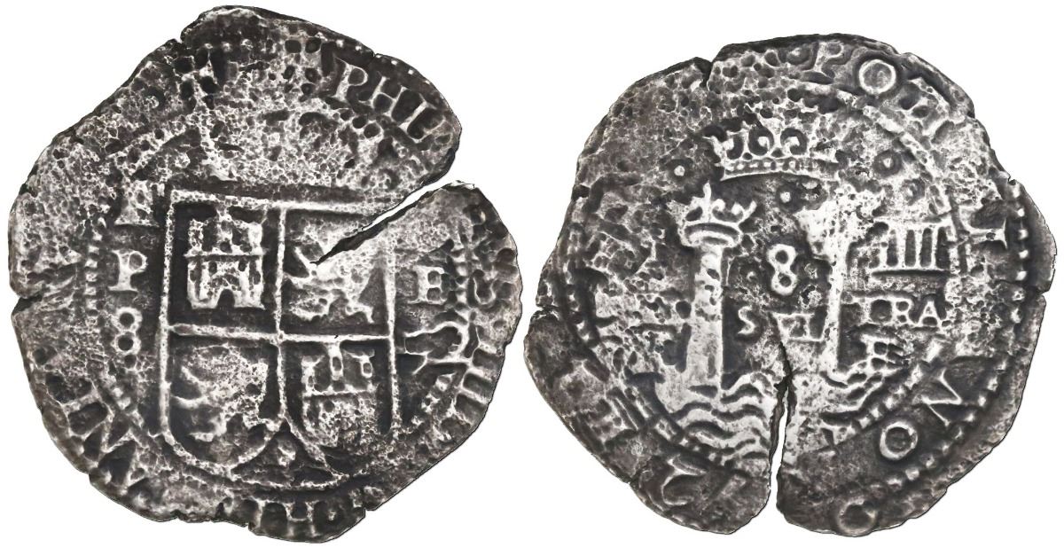 Potosi, Bolivia, cob 8 reales, (16)52E transitional Type II, extremely rare, from the Capitana (1654). S-P37; KM-A20.2; CT-unl. 20.10 grams. Choice full details all over despite moderate surface corrosion (VF details) and edge-crack, nicely toned, notorious Type with blank in center above waves. One of only two known examples of "die 2" of this Type, according to Mastalir. Pedigreed to the Roberto Mastalir collection, #II-A(1)3 in his book (page 61), from the Capitana (1654), with Herman Moro certificate.