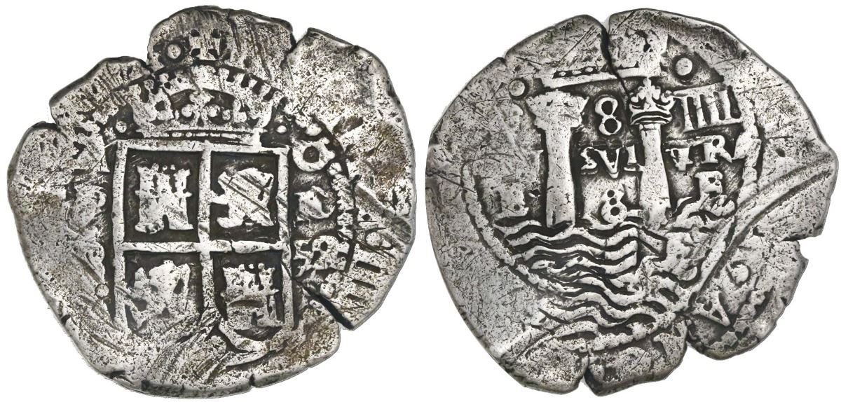 Potosi, Bolivia, cob 8 reales, (16)52E transitional Type IV, from the Capitana (1654).