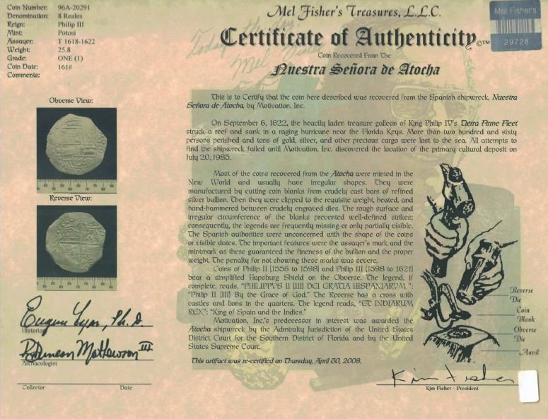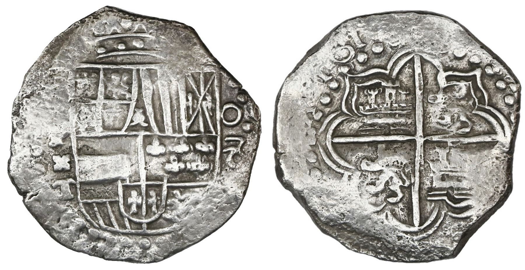 Potosi, Bolivia, cob 8 reales, 161(8)T, denomination o-8, Grade 1. S-P21; KM-10. 25.82 grams. Superb full cross-lions-castles with clear date except for last digit of date, which has to be 8 due to the denomination variety and P-x-T (both very clear on this coin), nice full shield as well, minimal surface corrosion. Pedigreed to the Classics collection, with Fisher tag and photo-certificate #96A-20291. Recovered from: Atocha, sunk in 1622 west of Key West, Florida