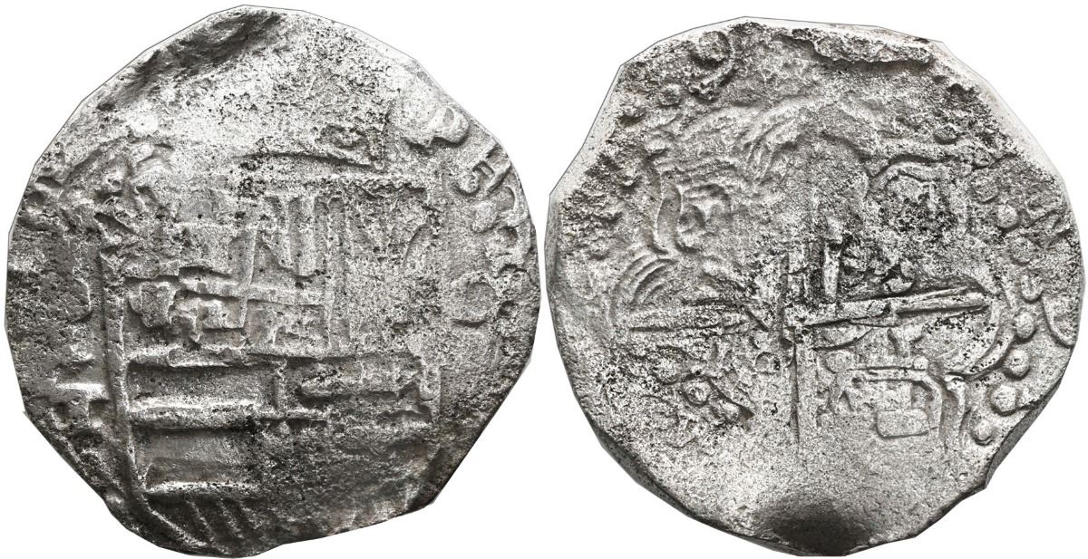Potosi, Bolivia, cob 8 reales, (161)9T, Grade 2. S-P21; KM-10; CT-133. 25.09 grams. Full 9 of date on a round flan with full but lightly corroded shield and cross (the former slightly doubled). With Fisher certificate #199815. Recovered from: Atocha, sunk in 1622 west of Key West, Florida