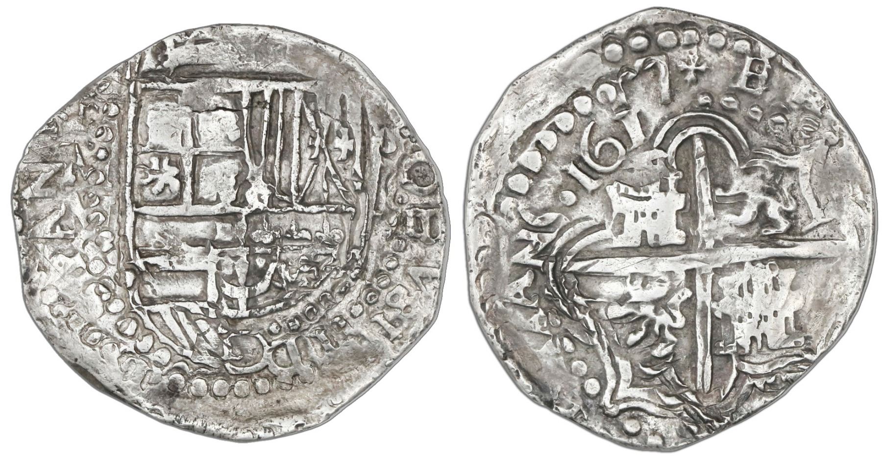 Potosi, Bolivia, cob 8 reales, 1617M. S-P19; KM-10; CT-129. 27.20 grams. Choice full date and cross and shield, nicely toned VF+ with doubling here and there