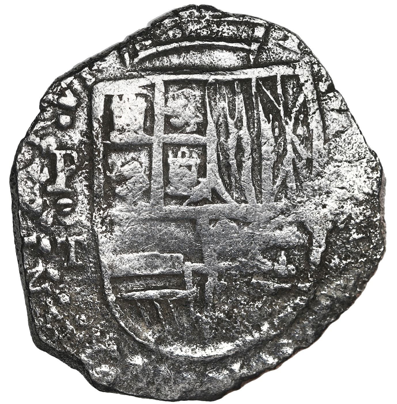 Potosi, Bolivia, cob 8 reales, 1619 T, Grade 1. S-P21; KM-10; Cal-927. 25.03 grams. Good full shield and cross, most of 9 of date, full P-dot-T, very light surface corrosion. With Fisher tag and certificate 85A-157478, pedigreed to the RWB Reference Collection of Atocha dated cobs. Recovered from: Atocha, sunk in 1622 west of Key West, Florida