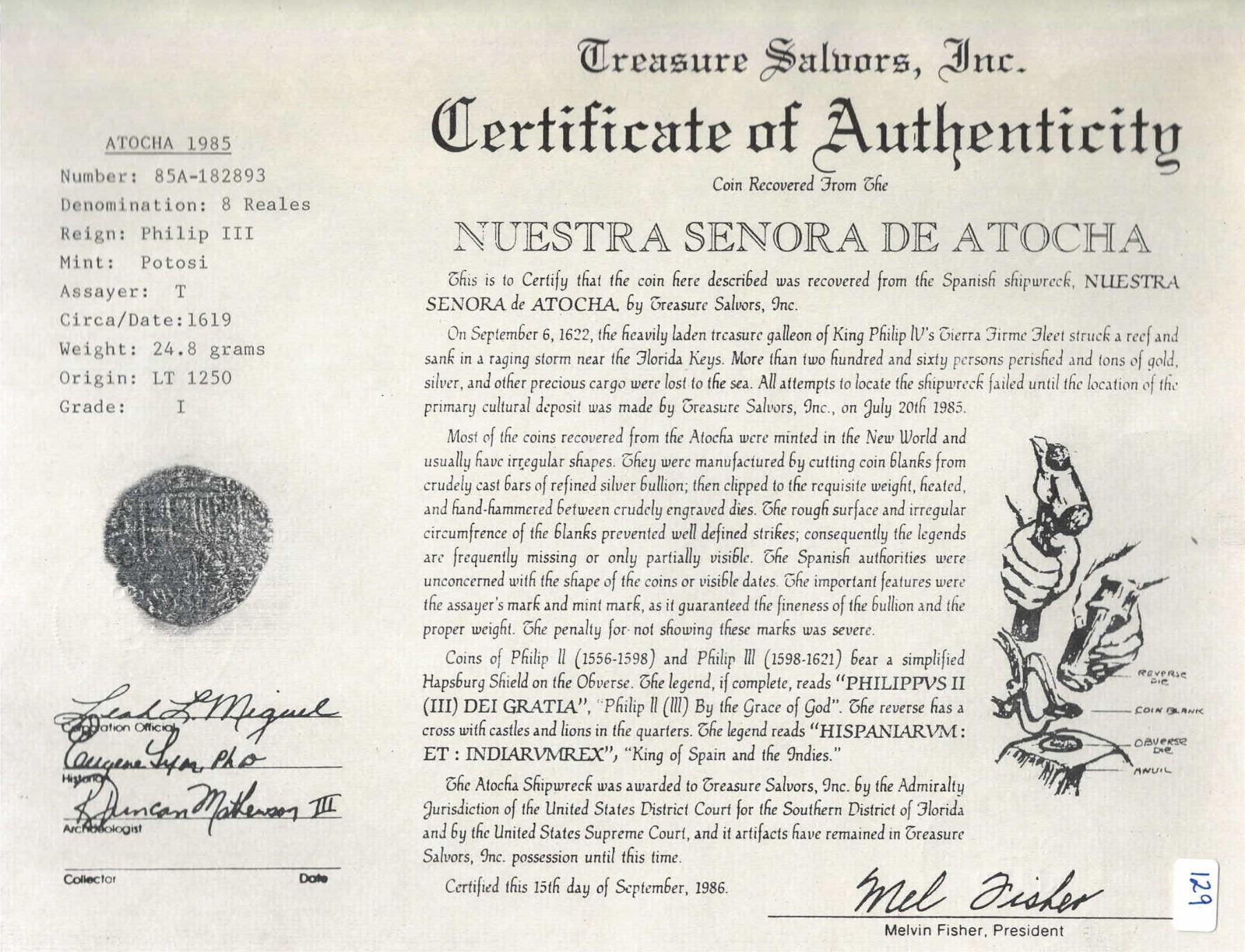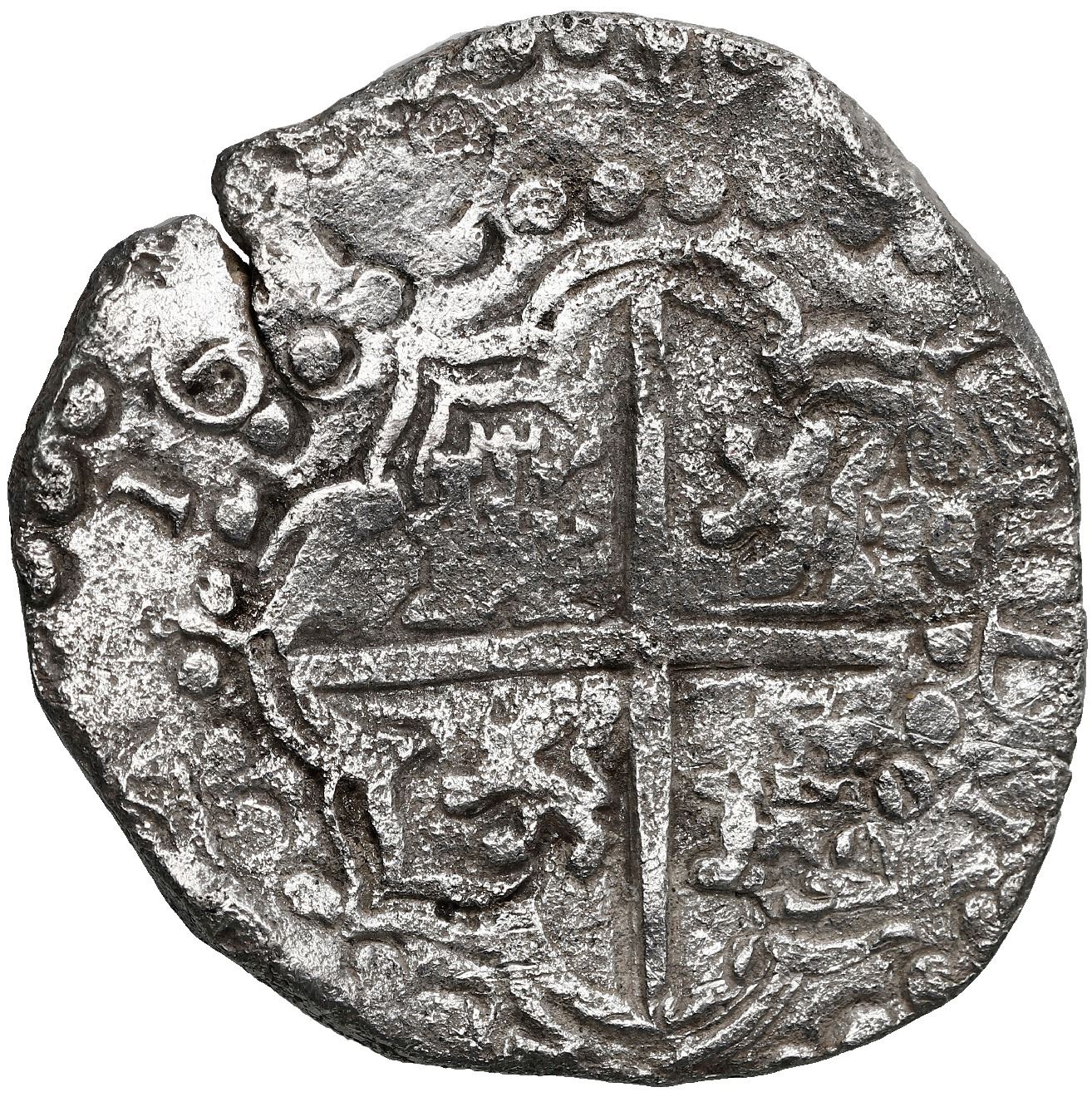 Potosi, Bolivia, cob 8 reales, 1619 T, Grade 1. S-P21; KM-10; Cal-927. 24.96 grams. Full date outside of full cross, full but lightly corroded shield, minor edge-split. With Fisher tag and certificate 85A-182893, pedigreed to the RWB Reference Collection of Atocha dated cobs. Recovered from: Atocha, sunk in 1622 west of Key West, Florida