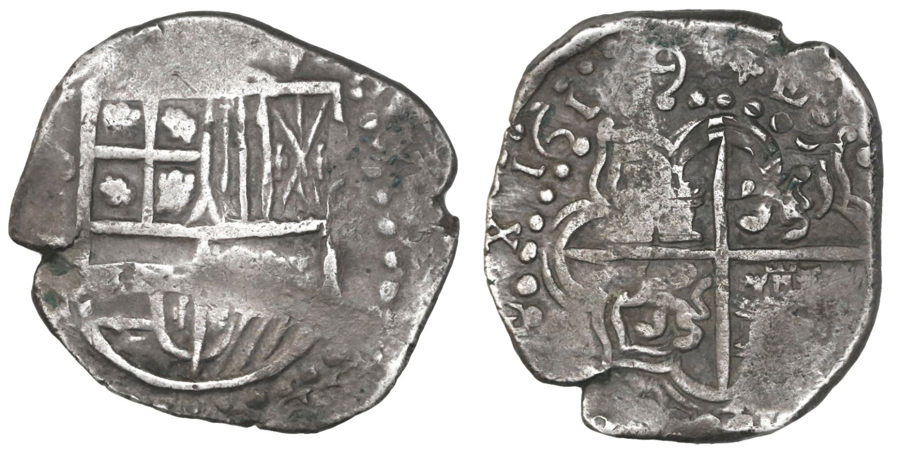 Potosi, Bolivia, cob 8 reales, 1619(T). S-P21; KM-10; CT-133. 27.07 grams. Very bold full date outside bold full cross, good full shield, non-salvage AVF, mostly deeply toned, two tiny edge-splits.