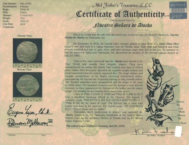 Potosi, Bolivia, cob 8 reales, 1619T, Grade 1. S-P21; KM-10; CT-133. 26.57 grams. Bold 19 of date outside of nice full cross, full and well-detailed but double-struck shield with bold P+T to left, no corrosion but typically silvery. Pedigreed to the Classics collection, with Fisher tag and photo-certificate #96A-20282. Recovered from: Atocha, sunk in 1622 west of Key West, Florida