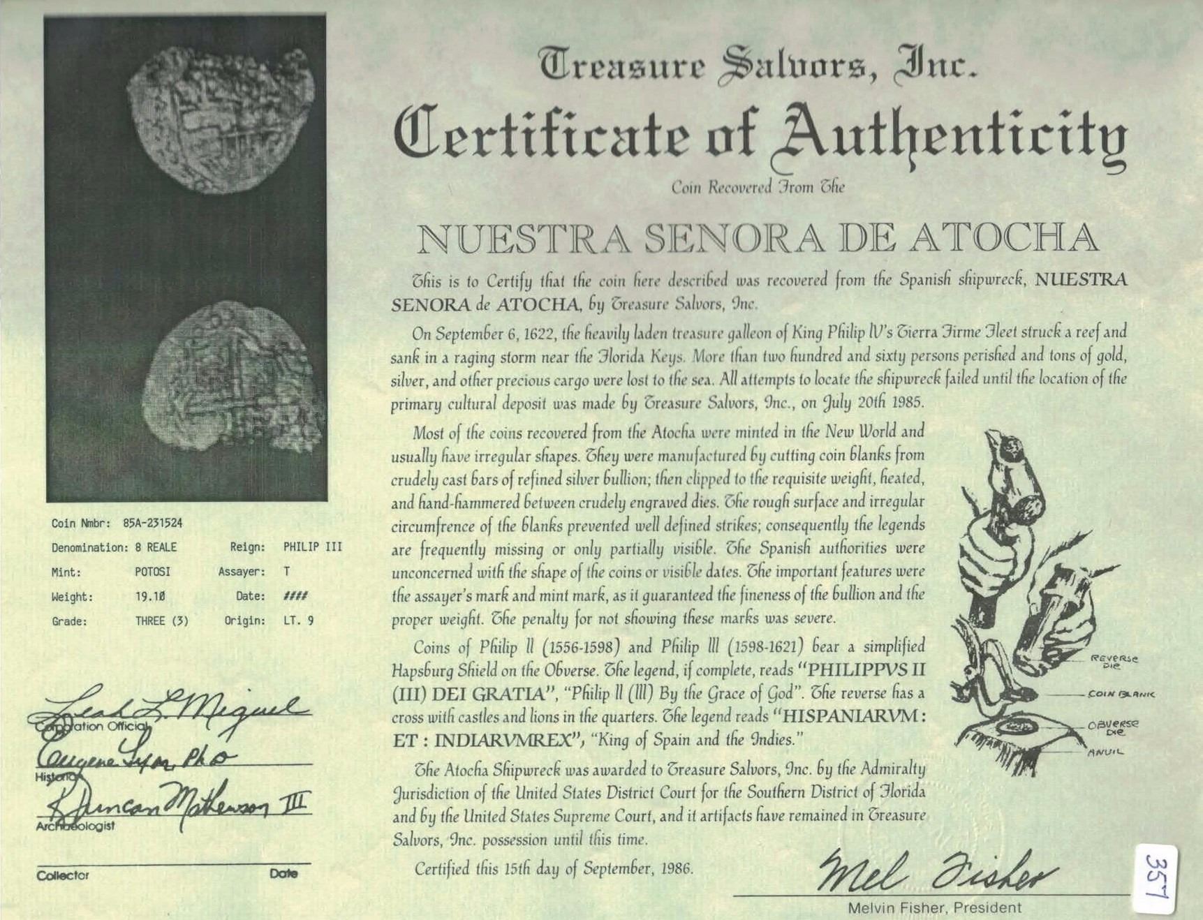 Potosi, Bolivia, cob 8 reales, 1619T, Grade 3. S-P21; KM-10; CT-133. 19.08 grams. Clear bottom half of 19 of date and assayer T, most of cross and shield (well detailed) despite moderate pitting and edge loss. With Fisher certificate #231524. Recovered from: Atocha, sunk in 1622 west of Key West, Florida