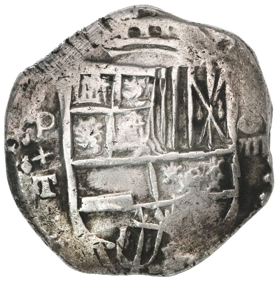 Potosi, Bolivia, cob 8 reales, 1619T, quadrants of cross transposed. S-P21; KM-10; Cal-928. 27.29 grams. Full (long) tail of 9 of date outside of nice full cross with bottom-right quadrant doubled, bold full shield (slightly doubled at bottom) with bold full P+T, XF with some toning on fields.