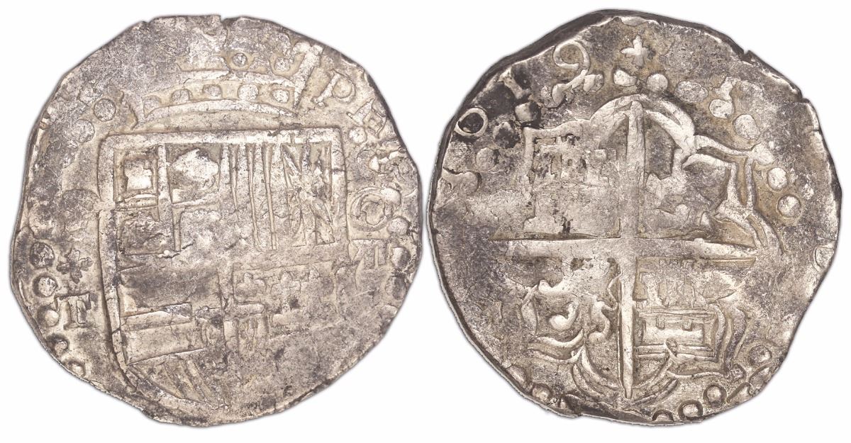 Potosi, Bolivia, cob 8 reales, 1619T. 27.14 grams. Very bold date outside full but partially weak cross, full shield and nearly full crown, clear P+T and denomination o-VIII, low-contrast AVF.