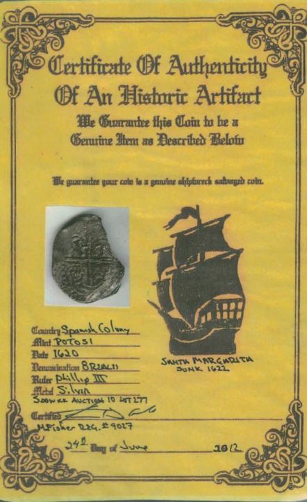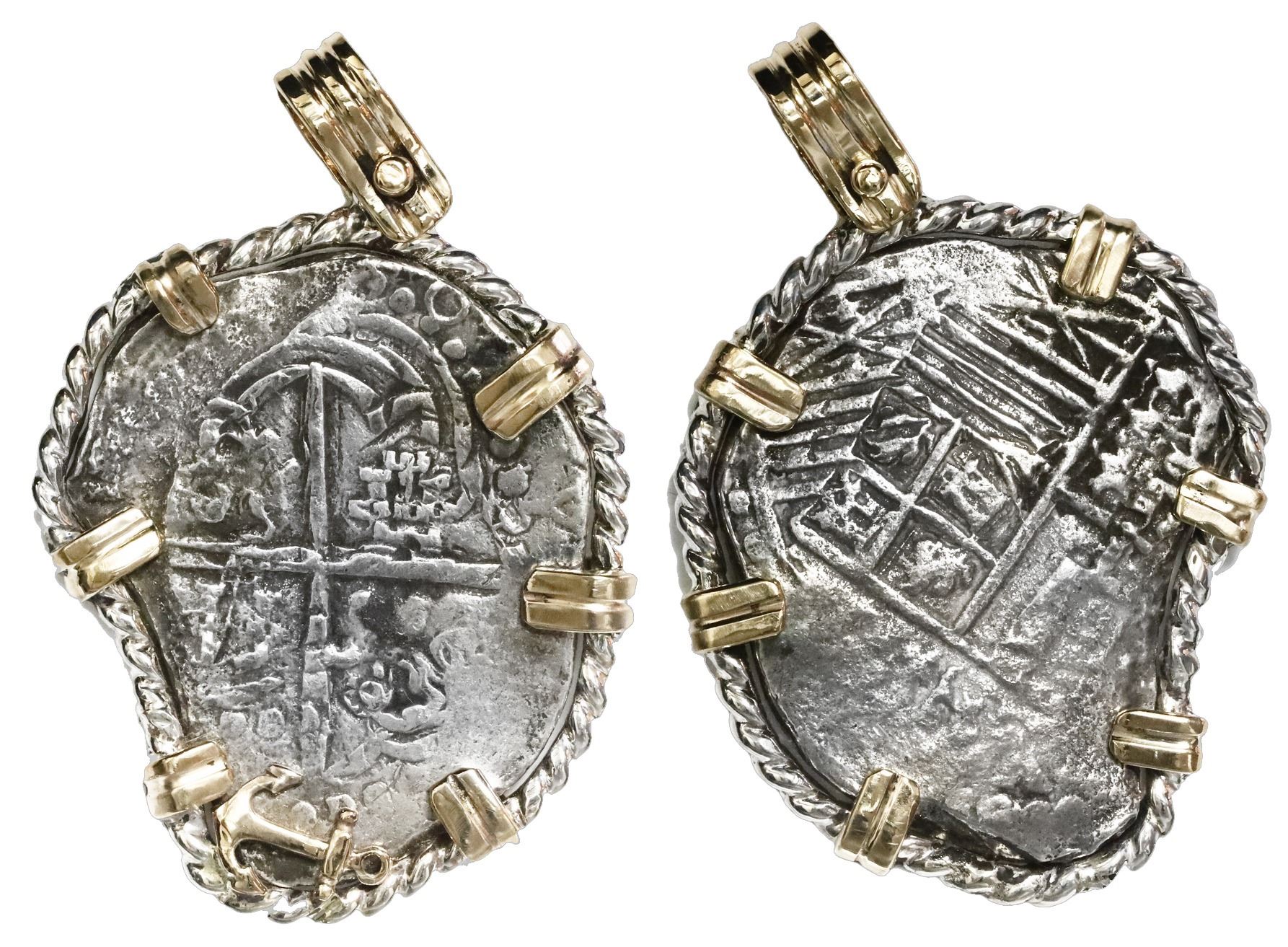Potosi, Bolivia, cob 8 reales, (162)0T, quadrants of cross transposed, Grade 3 (estimated), ex-Santa Margarita (1622), mounted cross-side out in twisted-rope silver bezel with 14K gold prongs, shackle bail and anchor embellishment. 28.27 grams total. Mounted with six prongs on long axis of coin, nearly aligned with full cross-lions-castles, nearly full shield on other side with rotated doubling, part of edge lost to corrosion, clear 0 of date just past 12 o'clock in the legend. From the Santa Margarita (1622), Fisher #9027 (tag and certificate missing), pedigreed to our Auction #10 (lot #277), with photo-certificate.