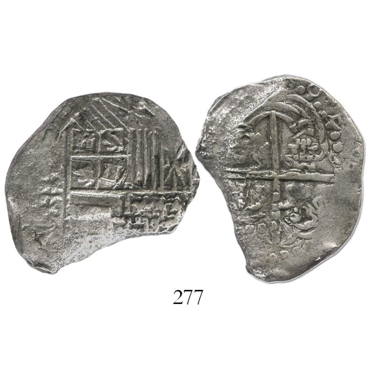 Potosi, Bolivia, cob 8 reales, (162)0T, quadrants of cross transposed, Grade 3 (estimated), with original tag but certificate missing. S-P21; KM-9; CT-248. 19.2 grams. Incomplete flan due to corrosion, but what remains is well detailed (full shield and cross, the former slightly doubled), with clear 0 of date just past 12 o'clock in the legend. With original Fisher insert-card #9027. Recovered from: Santa Margarita, sunk in 1622 west of Key West, Florida