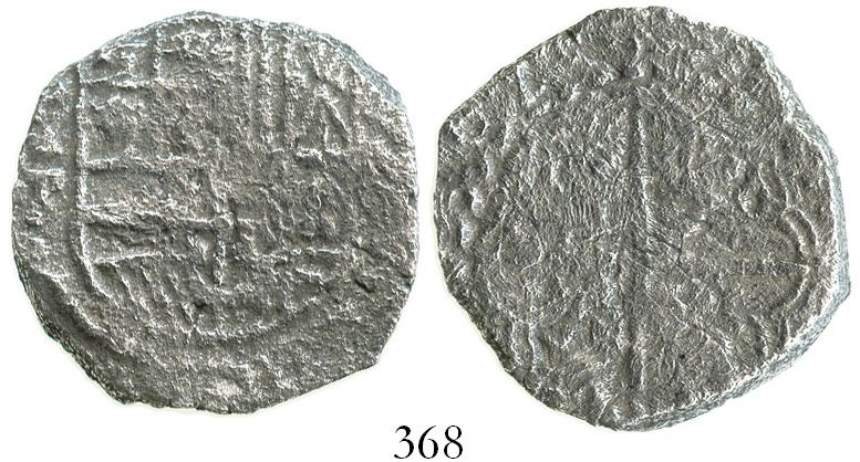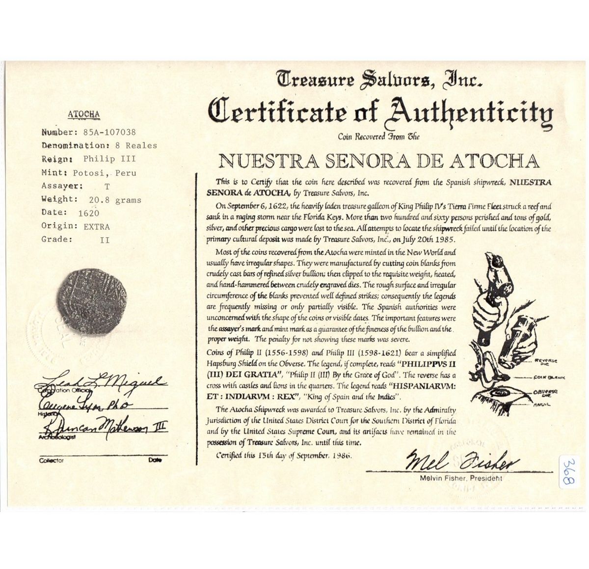 Potosi, Bolivia, cob 8 reales, 1620T, Grade-3 quality but Grade 2 on the certificate. S-P21; KM-10; CT-137. 20.9 grams. Bold date and assayer, full shield, full but weak cross, toned but moderately corroded all over. With Fisher certificate #107038. Recovered from: Atocha, sunk in 1622 west of Key West, Florida