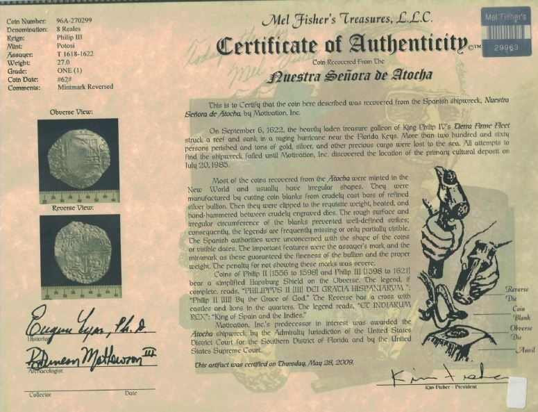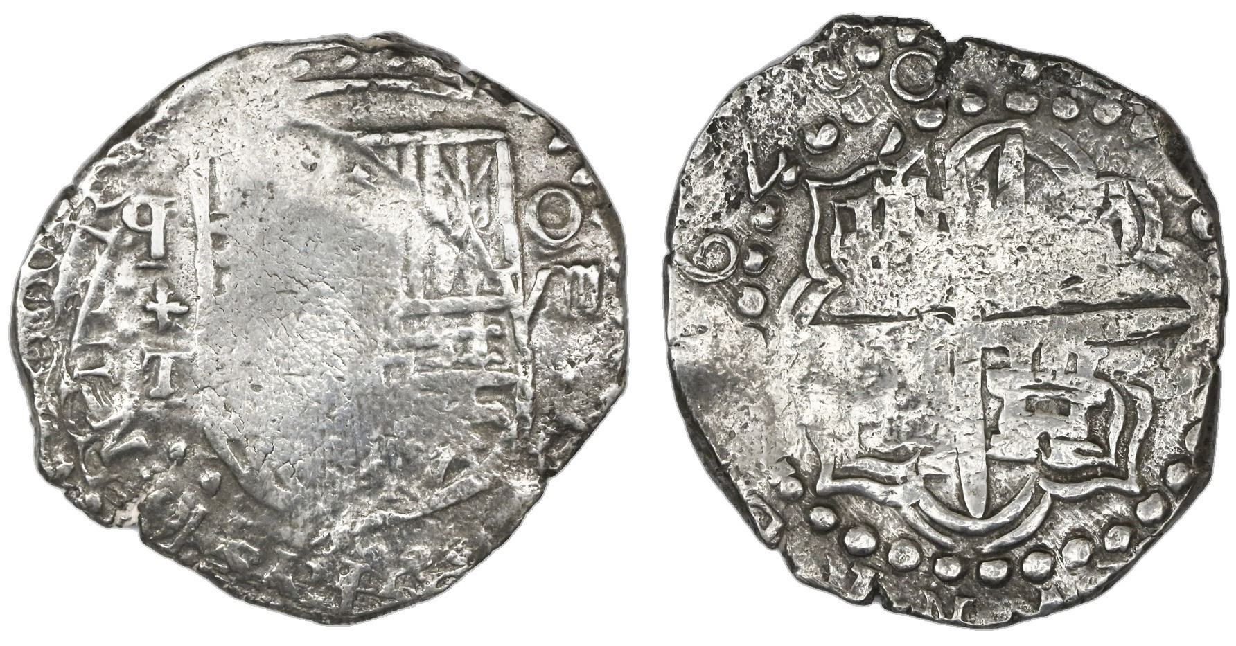 Potosi, Bolivia, cob 8 reales, 1620T, retrograde mintmark, Grade 1. S-P21; KM-10; CT-136. 27.03 grams. Thick and uncorroded flan but with flat centers, bold mintmark "q" (retrograde P) above + and T, also full denomination O-VIII and full date. Pedigreed to the Classics collection, with Fisher tag and photo-certificate #96A-270299. Recovered from: Atocha, sunk in 1622 west of Key West, Florida