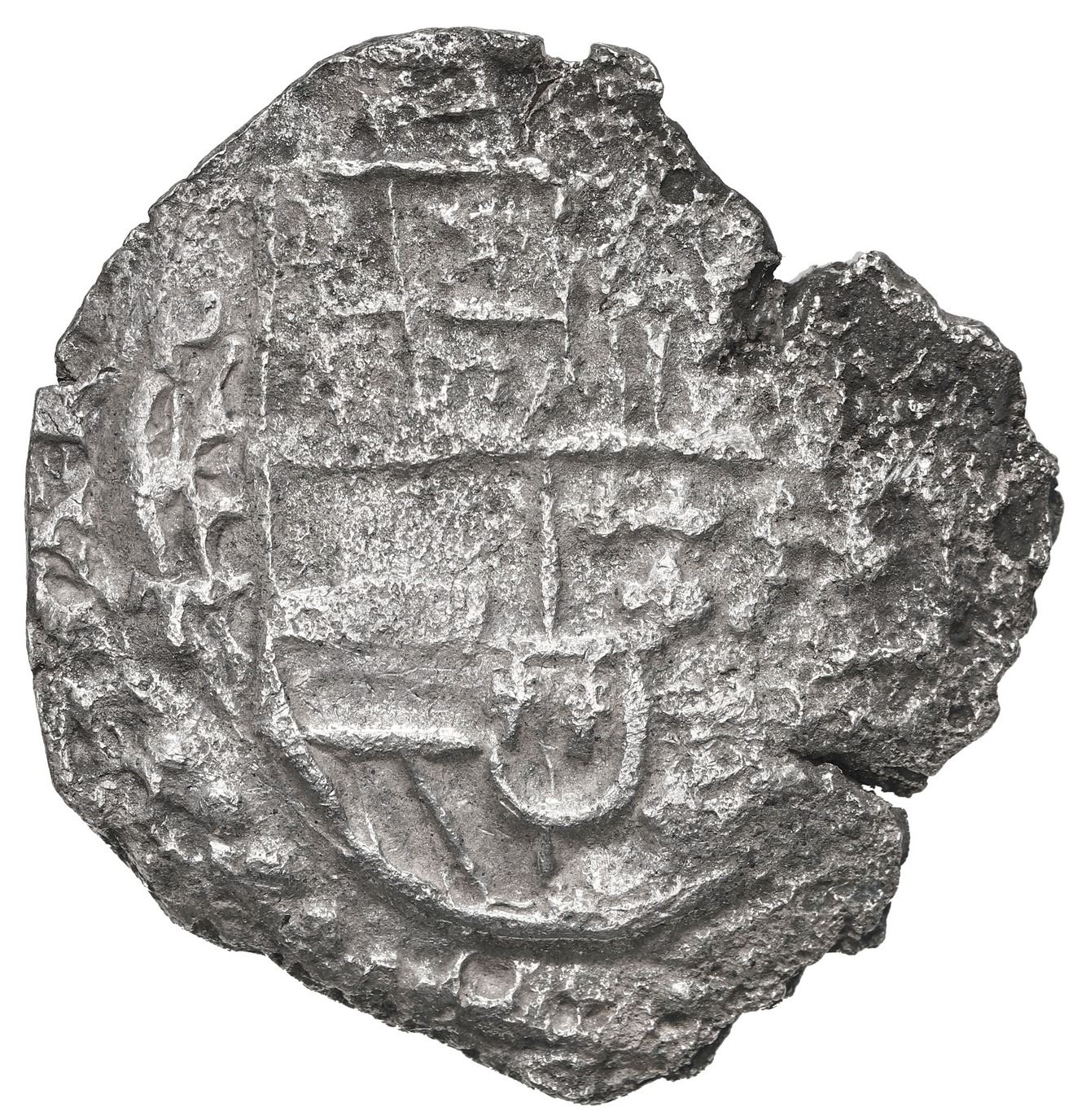 Potosi, Bolivia, cob 8 reales, 1621 T, date as "1612" (very rare), Grade 3. S-P21; KM-unl; Cal-unl. 21.57 grams. Full 612 of date, full shield and most of cross despite areas of heavy corrosion, lightly toned. With original Fisher tag and certificate 85A-133456. From: Atocha, sunk in 1622 west of Key West, Florida