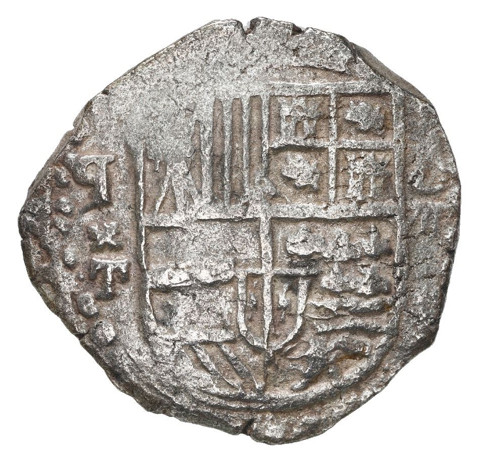 Potosi, Bolivia, cob 8 reales, 1621 T, date as "1612" (very rare), upper half of shield and quadrants of cross transposed, mintmark "q" (retrograde P), Grade 2. S-P21; KM-unl (10 for type); Cal-unl (cf 934). 26.14 grams. Clear "612" of date (last two digits transposed), very bold full q+T, good full shield and cross with multiple transpositions, lightly toned and practically corrosion-free. With Fisher tag and certificate 124070 (date mentioned as "#61#"). Recovered from: Atocha, sunk in 1622 west of Key West, Florida