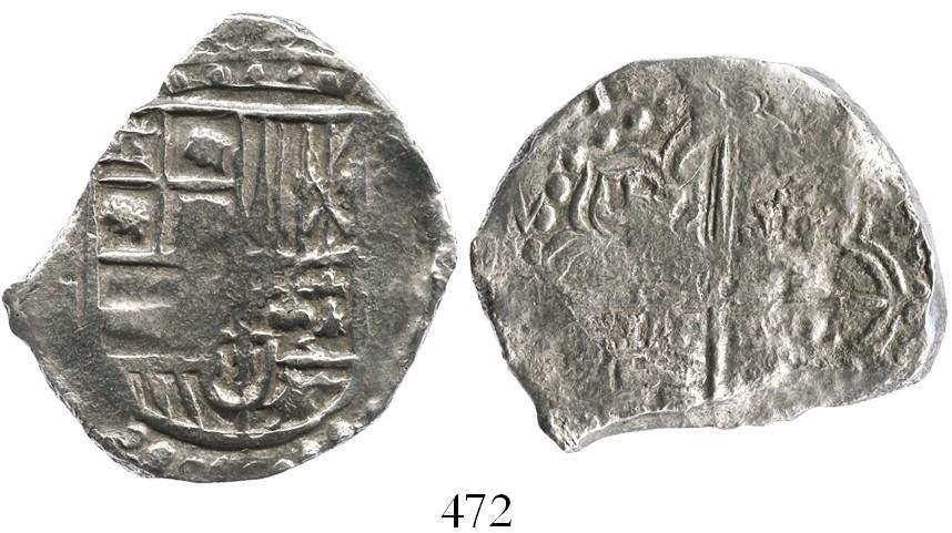 Potosi, Bolivia, cob 8 reales, 1621(T), quadrants of cross transposed, Grade 3. S-P21; KM-10. 21.1 grams. Unusually bold full shield, nearly full cross but with part of edge missing, clear 2 of date and bottom of final digit 1. From the Atocha, sunk in 1622 west of Key West, Florida, with Sinclair photo-certificate #41172.