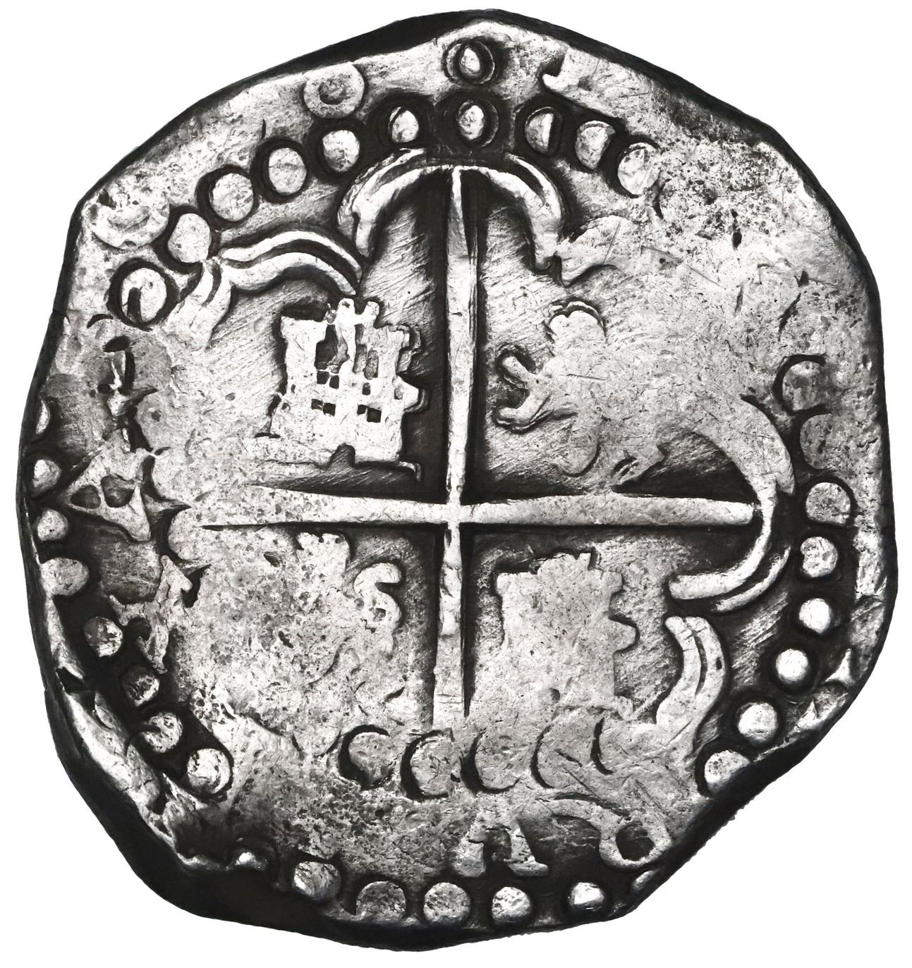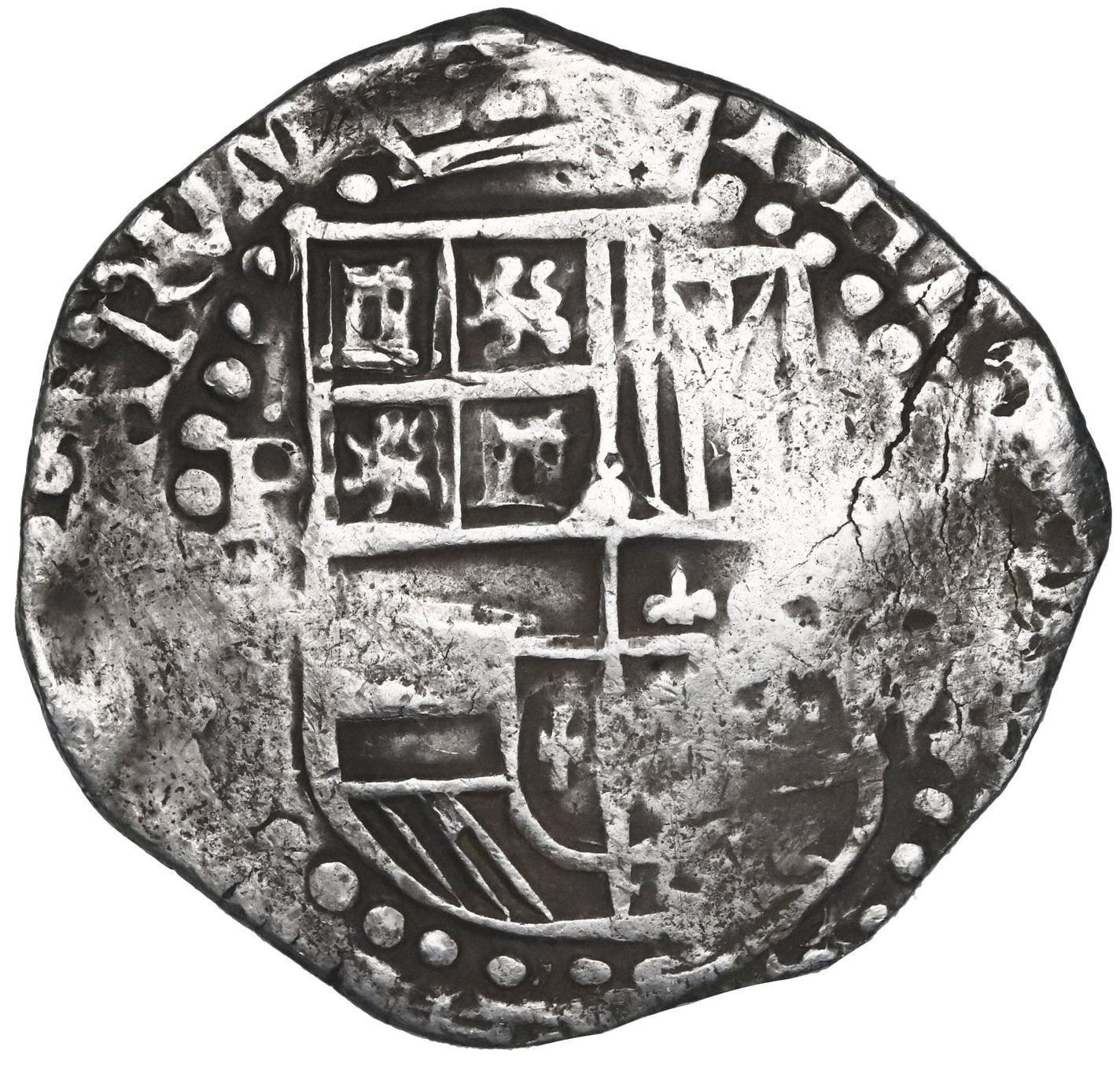Potosi, Bolivia, cob 8 reales, 1628 (T). S-P24; KM-19a; Cal-1451. 26.53 grams. Broad-flan VF+ with good full shield and cross despite flat spots, clear bottom half of 8 of date with "hunched over" lions that began in this year, toned in crevices.