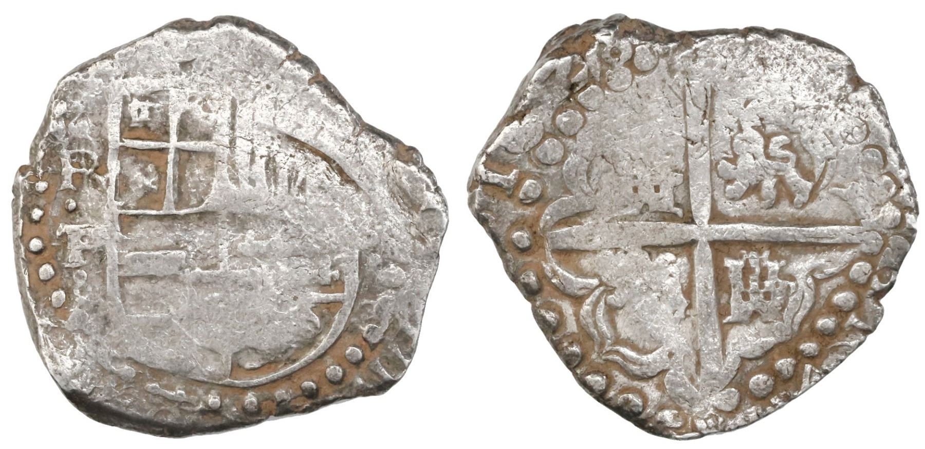 Potosi, Bolivia, cob 8 reales, 1628P/T, ex-"Panama hoard." S-P25; KM-19a; CT-469. 25.03 grams. Bold full cross with bold date, good full shield with full dot-P-dot-P/T-dot to left, AVF with bright orange sediment in crevices, flat areas. From the ca.-1629 "Panama hoard."