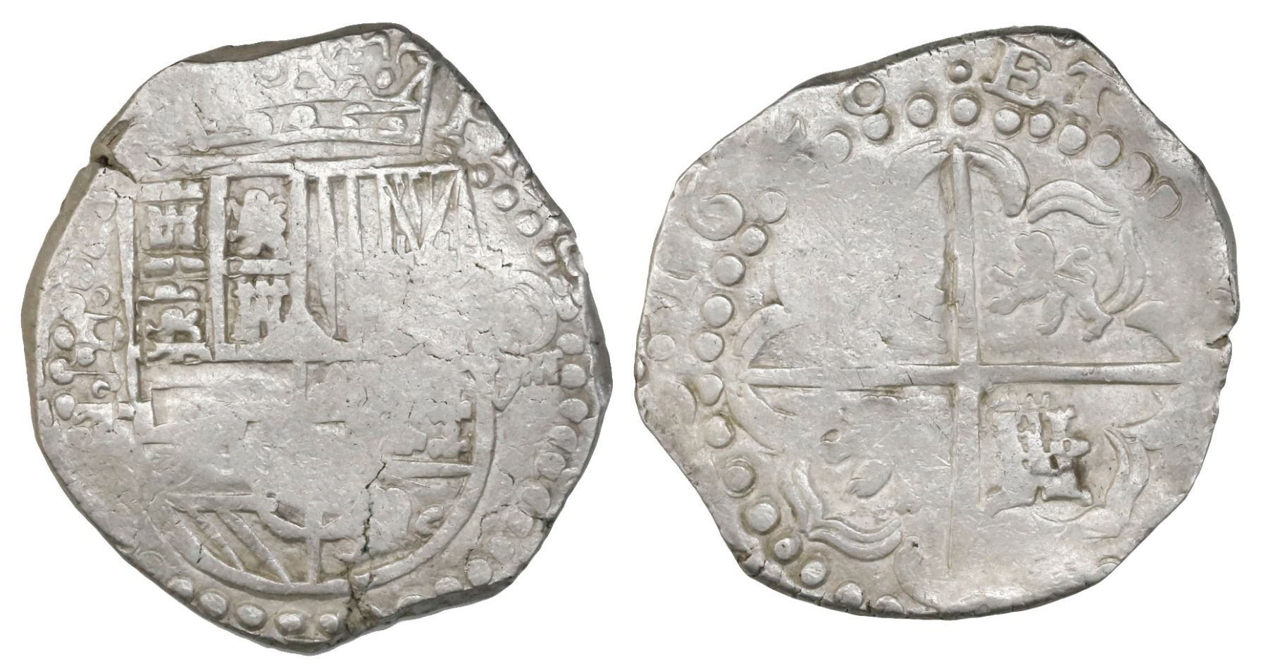 Potosi, Bolivia, cob 8 reales, 1628T. S-P24; KM-19a; CT-468. 26.53 grams. Full and clear date outside full cross with distinctive lions, full shield with dot-P-dot-T to left and denomination to right, non-toned and softly struck VF with flat areas.