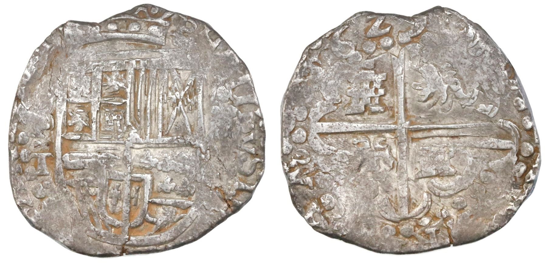 Potosi, Bolivia, cob 8 reales, 1629T, large-dot borders, ex-"Panama hoard." S-P26; KM-19a; CT-470. 26.61 grams. Unevenly thick flan with good full shield and cross, bold 629 of date, full dot-P-dot-T-dot, VF+ with orange sediment in crevices. From the ca.-1629 "Panama hoard."