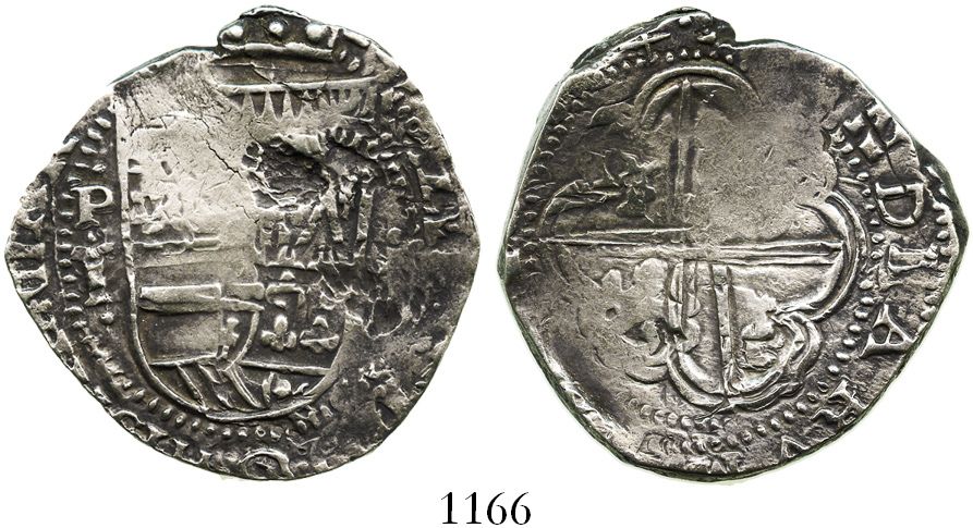 Potosi, Bolivia, cob 8 reales, (163)4T, rare. S-P26; KM-19a; CT-476. 26.9 grams. Bold AVF with flat spot and void in full but doubled shield, bold P-T, the cross also doubled and somewhat flat due to uneven thickness, toned on fields.