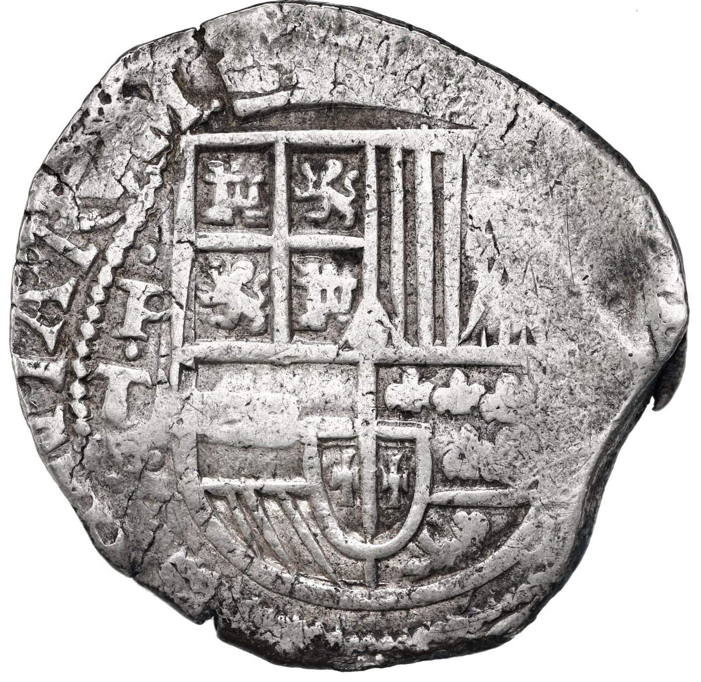 Potosi, Bolivia, cob 8 reales, 1630 T. S-P26; KM-19a; Cal-1455. 27.16 grams. Well-detailed full shield and cross, clear 30 of date, full dot-P-dot-T-dot, lightly toned AXF with parts of edge crude (as made).
