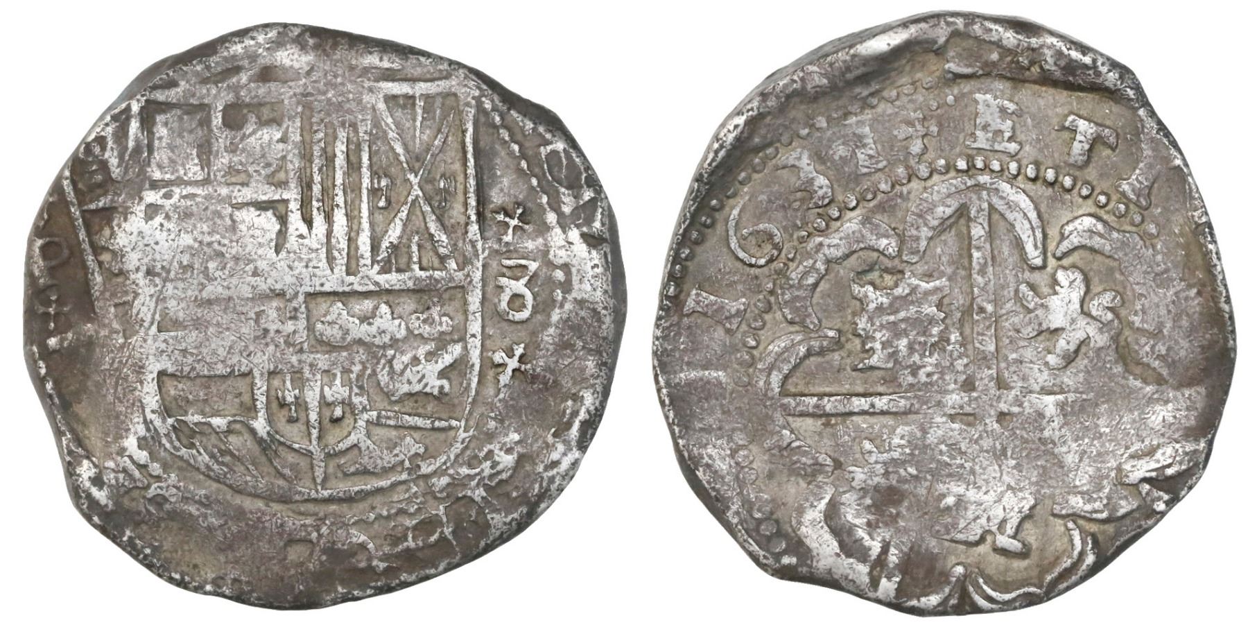 Potosi, Bolivia, cob 8 reales, 1631T, x-shaped ornaments, rare. S-P26; KM-19a; CT-473. 26.87 grams. Uneven flan (varying from 2mm to 5mm in thickness) with naturally crude edge, 100% full date outside of off-center cross, good full shield, clear P-x-T and x-8-x, the x ornaments being small fleury crosses (also appearing after the date) characteristic of late 1630 and 1631 issues only, toned VF.