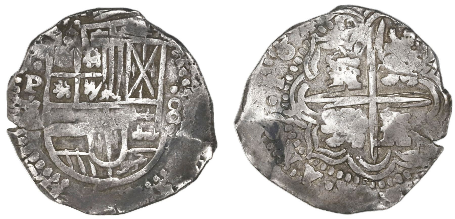 Potosi, Bolivia, cob 8 reales, 164(7?)Z/?, rare. S-P34; KM-19a. 27.46 grams. Broad flan with good full shield, full but off-center cross, bold denomination 8 and mintmark P but assayer somewhat weak (looks like Z/V), with full 164 of date followed by what looks like the tail of a final digit 7. Pedigreed to our Auction #12, with original lot-tag #1045.