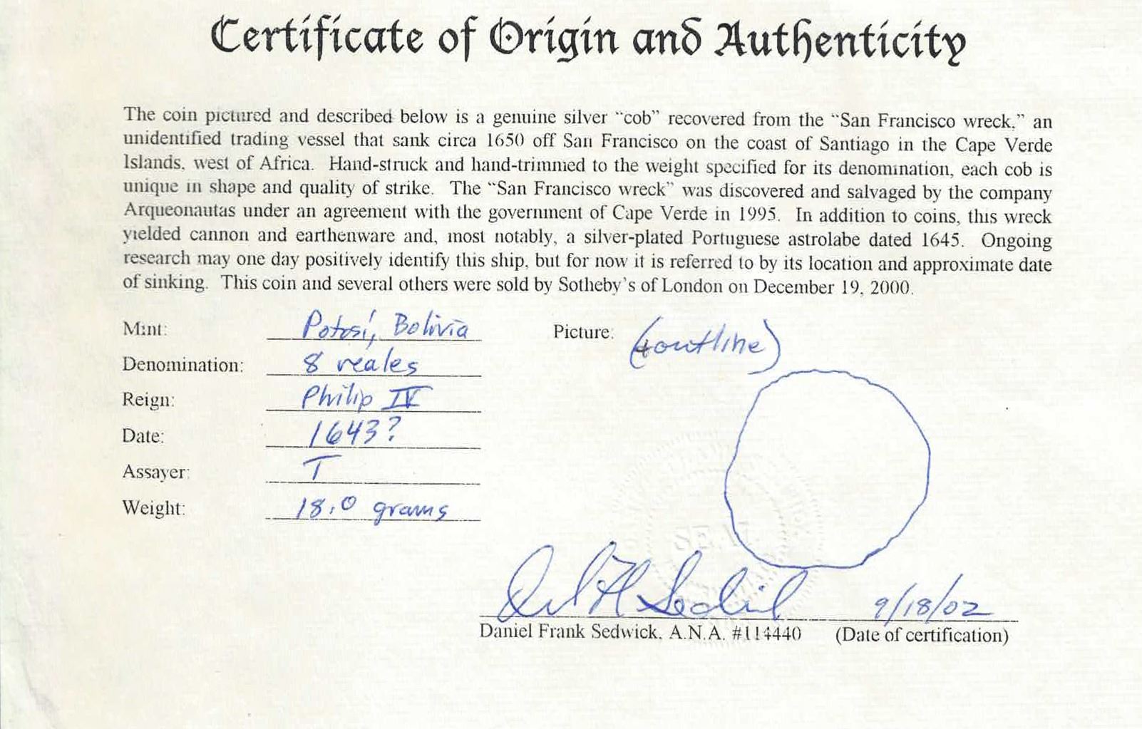 Potosi, Bolivia, cob 8 reales, 1643 TR, rare provenance. S-P29a; KM-19a; Cal-unl. 18.06 grams. Rare provenance (salvaged by Arqueonautas) and one of very few dated cobs we have seen from this wreck (also a very rare date and assayer). Corroded yet plentiful remaining detail including nice full cross and date With Sedwick certificate from 2002.Recovered from: "San Francisco wreck," sunk ca. 1647 off the Cape Verde Islands, west of Africa.
