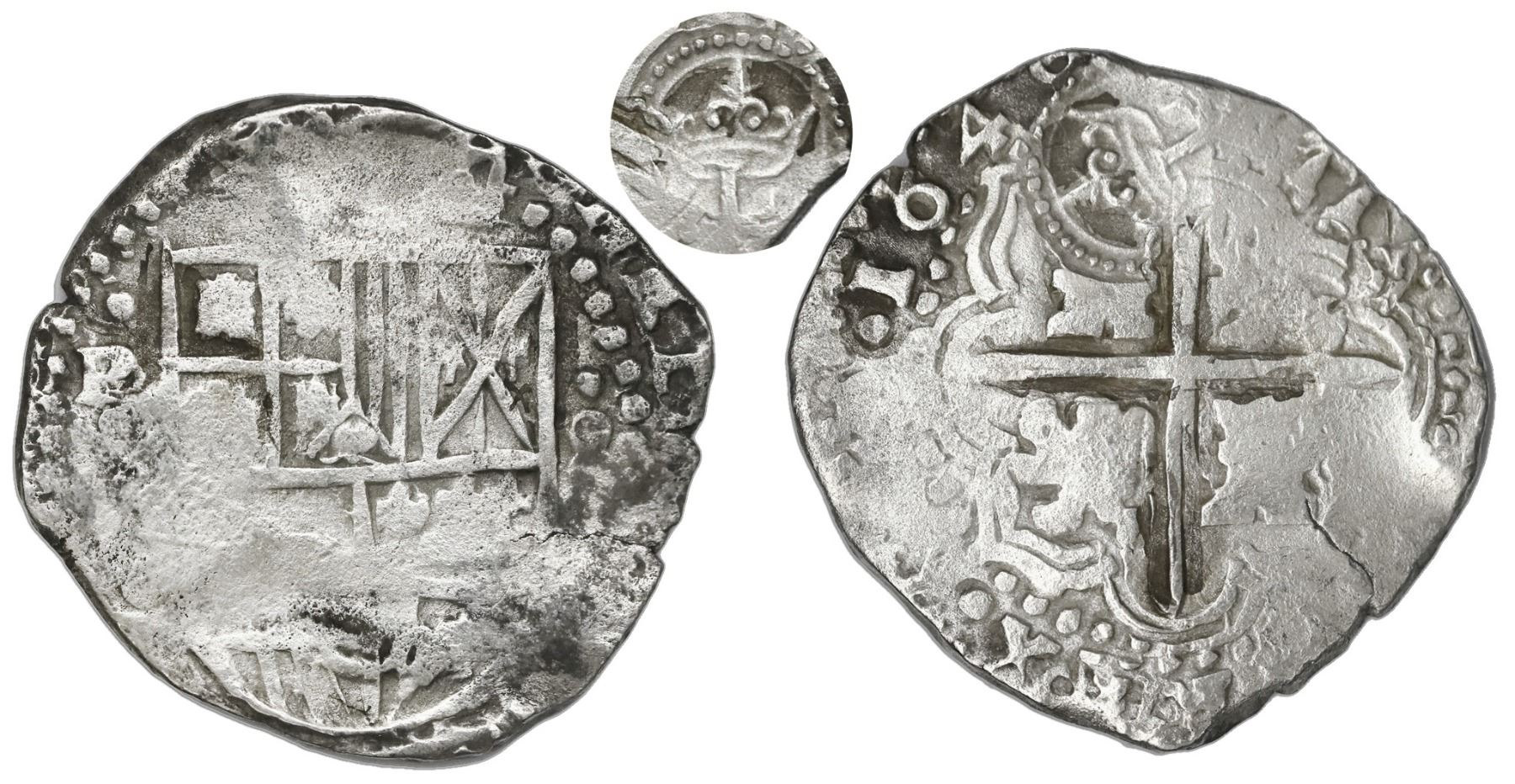 Potosi, Bolivia, cob 8 reales, 1649(O), with crowned-L countermark on cross. S-P35; KM-19b; Cal-1487. 25.29 grams. Very bold full 164 and clear 9 of date, also bold but partially flat shield and cross, nearly full countermark, much less surface corrosion and smoothing than usual. Pedigreed to the Rob McClung collection.Recovered from: Capitana, sunk in 1654 off Chanduy, Ecuador