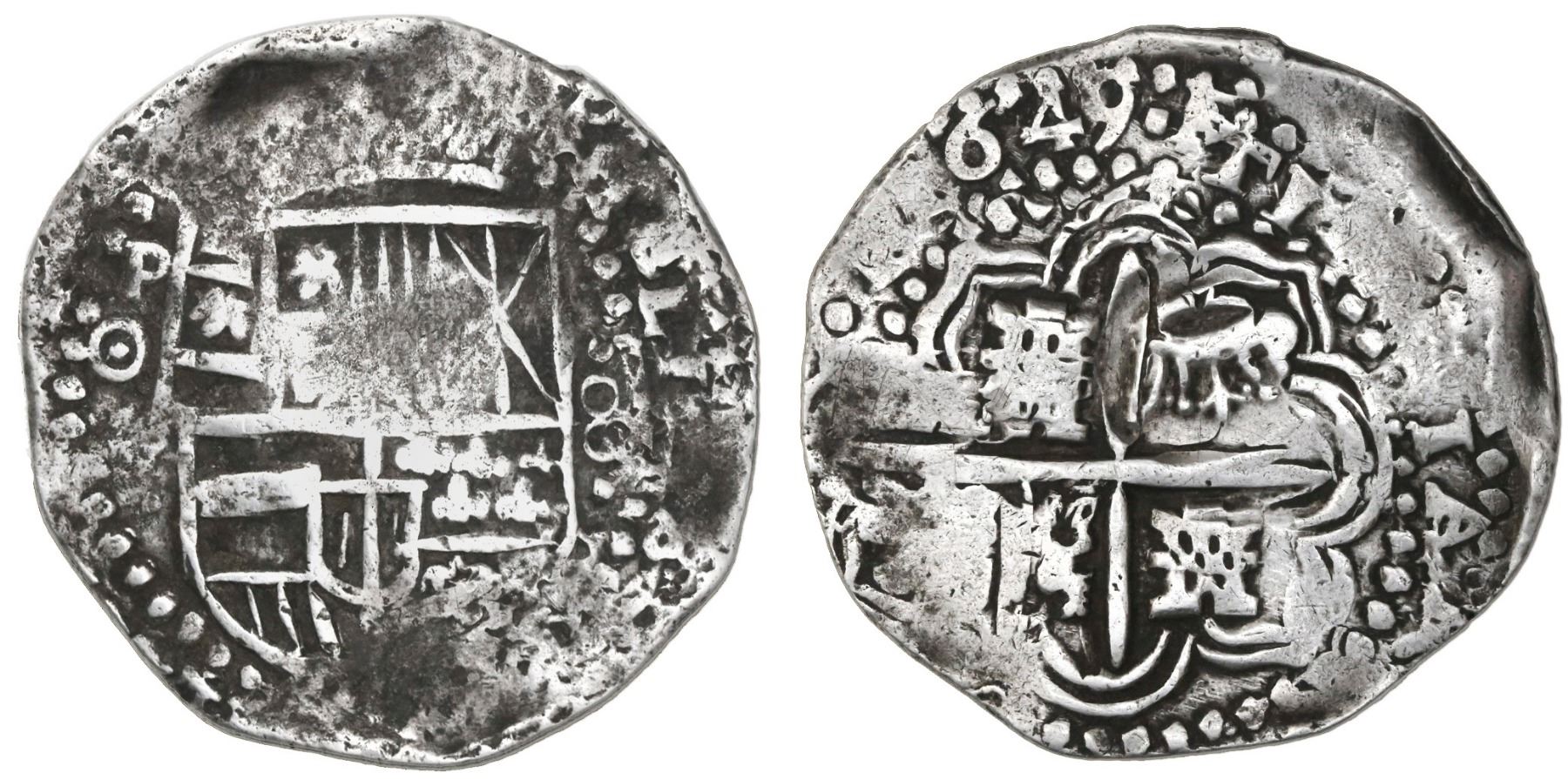 Potosi, Bolivia, cob 8 reales, 1649O, with crown-alone countermark (rare type) on cross. S-P35; KM-19b; CT-506. 25.37 grams. Broad, round flan (almost Royal-like) with full cross and shield, bold full P-O and denomination but best of all is the very bold 649 date, along with complete countermark in one quadrant of the cross, AVF with some flat spots and minor doubling, also spotty toning, rare as non-salvage.