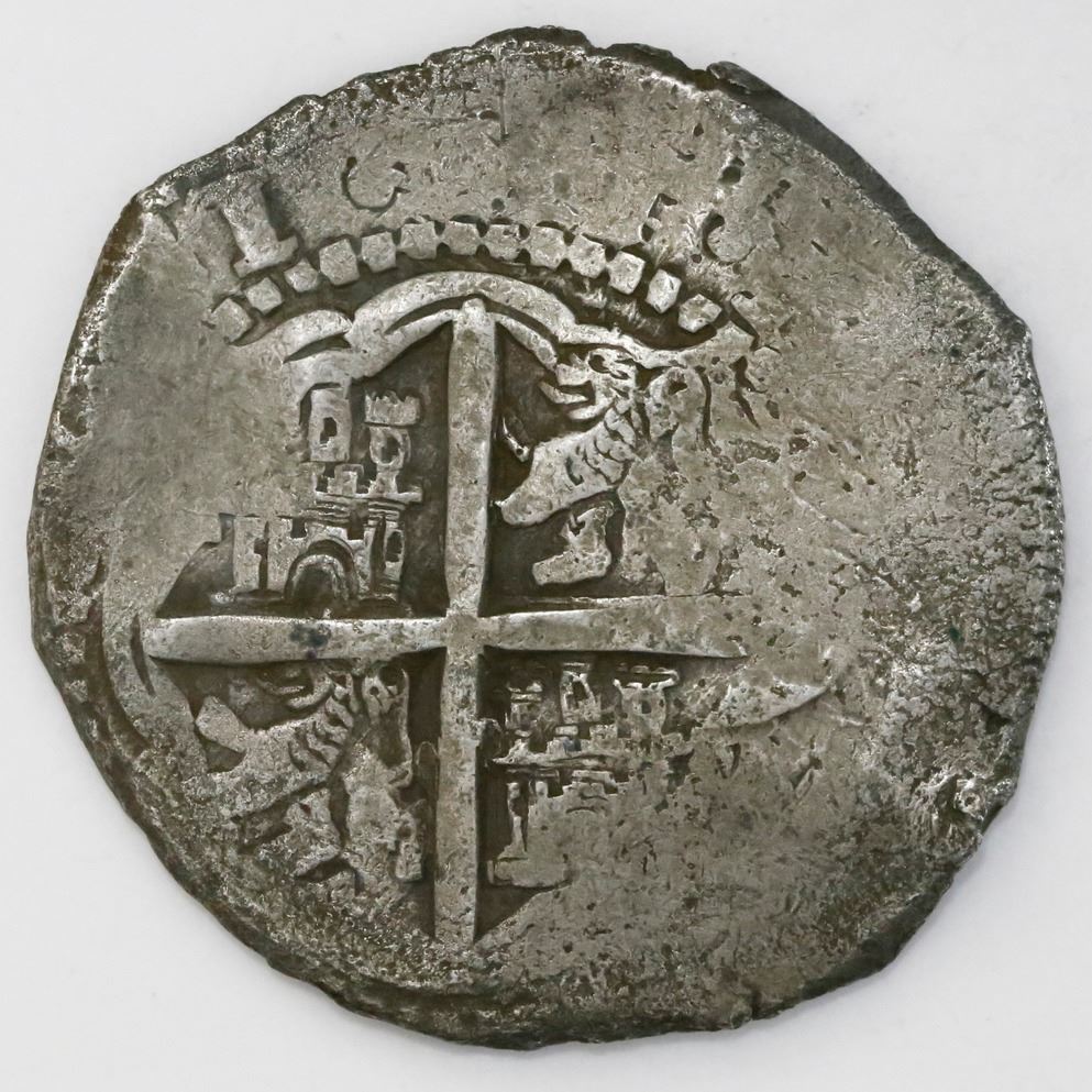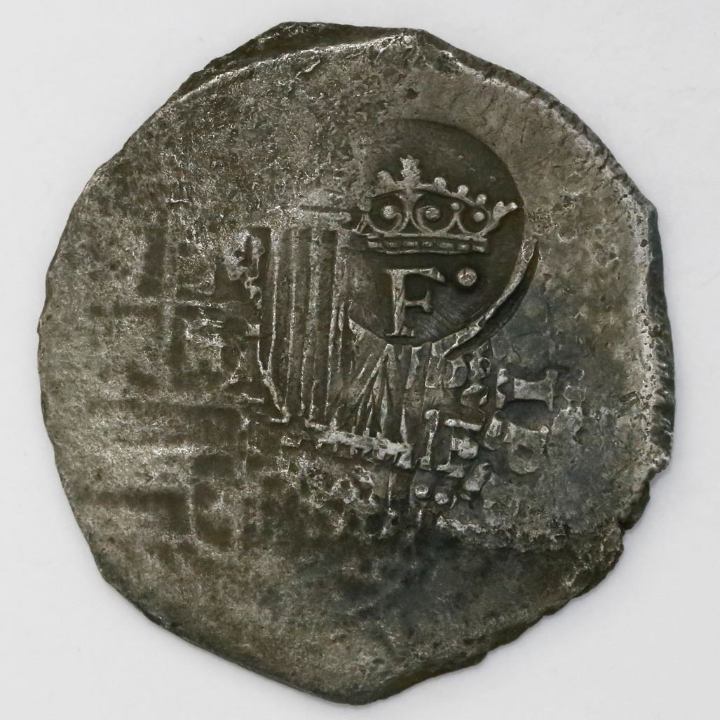 Potosi, Bolivia, cob 8 reales, (165)1E, with crowned-dot-F-dot countermark on shield. S-P36; KM-19b; CT-511. 24.49 grams. Choice full countermark with no dots above crown, nice full cross with bold 1 of date in legend, some flatness but light corrosion only on shield side. Pedigreed to our Auction #1, with original lot-tag #131. Recovered from: Maravillas, sunk in 1656 off Grand Bahama Island