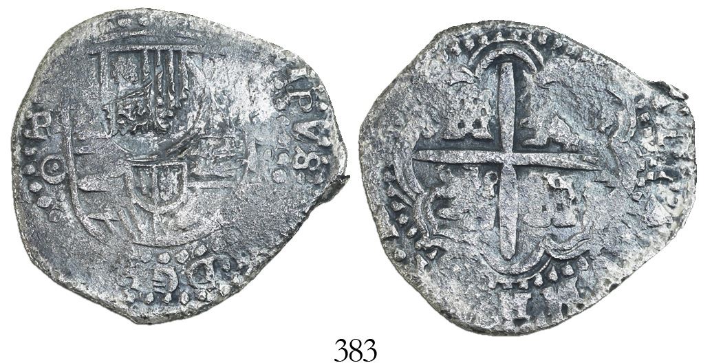 Potosi, Bolivia, cob 8 reales, (1650-1)O, with crowned-(?) countermark on shield. S-P35; KM-19b. 23.41 grams. Bold P-O, full shield and cross, full crown in countermark, toning and light surface corrosion all over. Pedigreed to our Auction #9, with original lot-tag #665, and to our auction #6, with original lot-tag #330. Recovered from: Capitana, sunk in 1654 off Chanduy, Ecuador