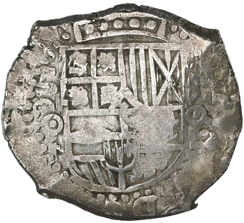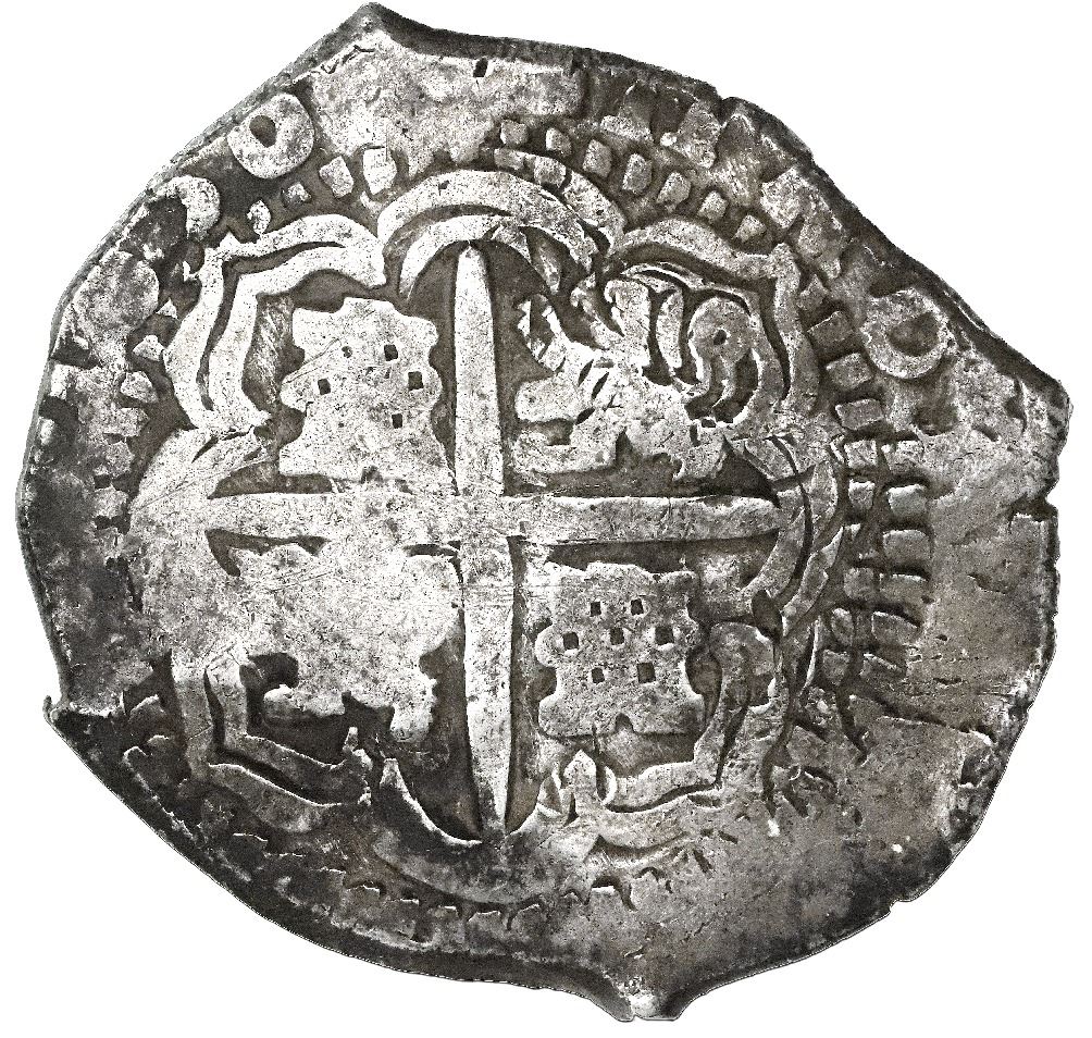 Potosi, Bolivia, cob 8 reales, 1650O, no countermark (rare). S-P35; KM-19b; Cal-1488. 27.48 grams. Interesting shape (round with four points) with full but softly struck shield and cross, full P-O and 8-O, bold bottom half of all four digits of the date, AVF with light scratches in center of cross, rather rare as non-salvage and non-countermarked.
