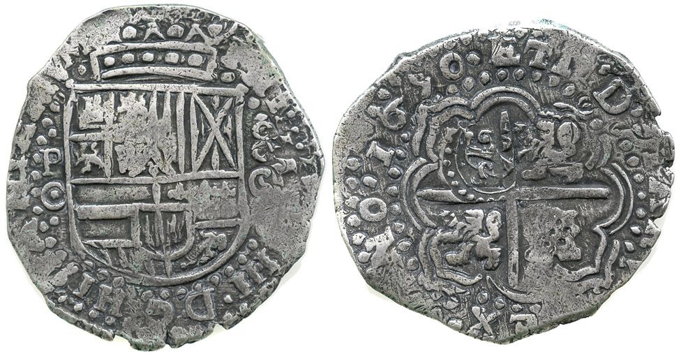 Potosi, Bolivia, cob 8 reales, 1650O, with crowned-S countermark on cross.