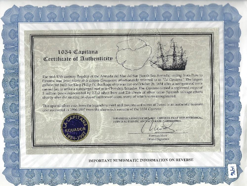 Potosi, Bolivia, cob 8 reales, 1651E, with crowned-O countermark on cross. S-P36; KM-19b; Cal-1491. 16.75 grams. Corroded silvery surfaces with partial shield visible, better cross side with evenly struck countermark, several edge-splits. With original Herman Moro certificate. From: Capitana, sunk in 1654 off Chanduy, Ecuador
