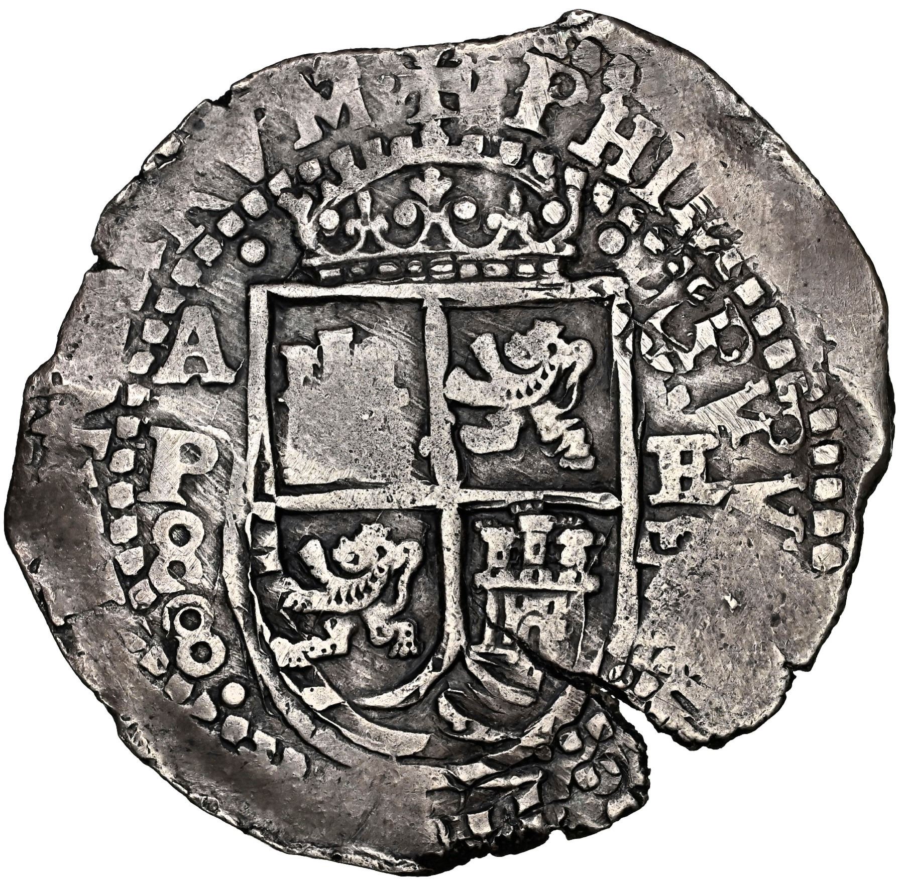 Potosi, Bolivia, cob 8 reales, 1652 E Transitional Type VII/A, NGC AU 50 / Maravillas (Shipwreck Blue Label). S-P37; KM-A20.7; Cal-1496. 27.33 grams. Superb example in high grade with lovely toning all over (no corrosion, of course), full interior details on both sides (pillars with HP monogram above, P-8-E across top and E-52-P across bottom per Mastalir VII.1-A), all three dates and mintmarks and assayers, one edge-split. Pedigreed to the Espinola collection (stated on label). Recovered from: Maravillas, sunk in 1656 off Grand Bahama Island Please use this link to verify the certification number