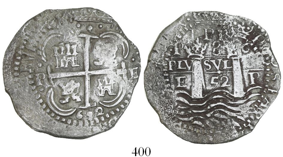 Potosi, Bolivia, cob 8 reales, 1652E, 1-PH-6 at top, post-transitional (Transitional Type VIII/B). S-P37a; KM-21; CT-434. 22.32 grams. Choice full pillars-and-waves, full but slightly off-center cross, traces of doubling and surface corrosion, light toning and sediment in crevices, two dates and assayers, three mintmarks. Pedigreed to the Rob McClung collection. Recovered from: Capitana, sunk in 1654 off Chanduy, Ecuador